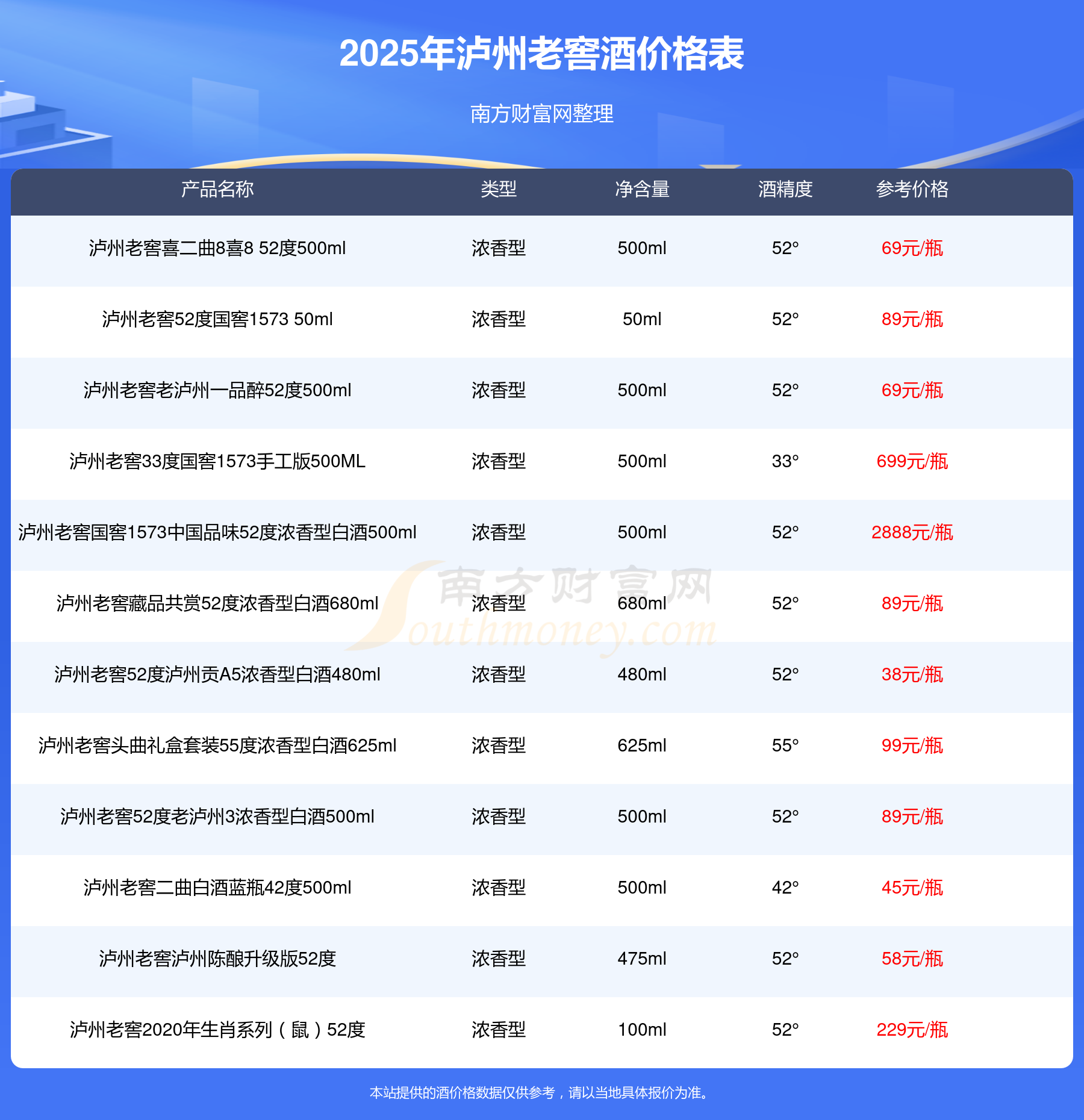 瀘州老窖酒最新價格2025:瀘州老窖國窖1573春釀鼠兆豐年E 55度參考價17999元/瓶、瀘州老窖國窖1573生命中的那壇酒55度014參考價9999元/瓶、瀘州老窖國窖1573春釀鼠兆豐年A 55度參考價5088元/瓶。