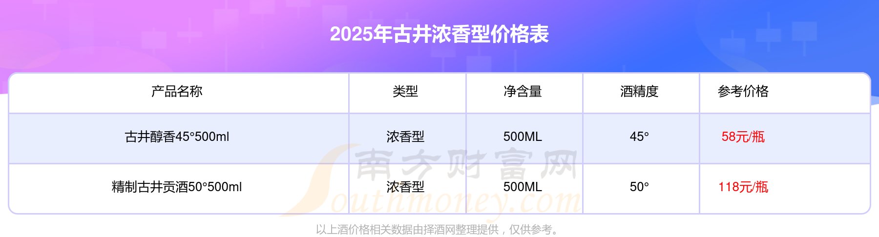 2025年,古井濃香型酒價格最高的是精制古井貢酒50°500ml,參考價118元,最低的是古井醇香45°500ml,參考價58元,價格高低差為60元。