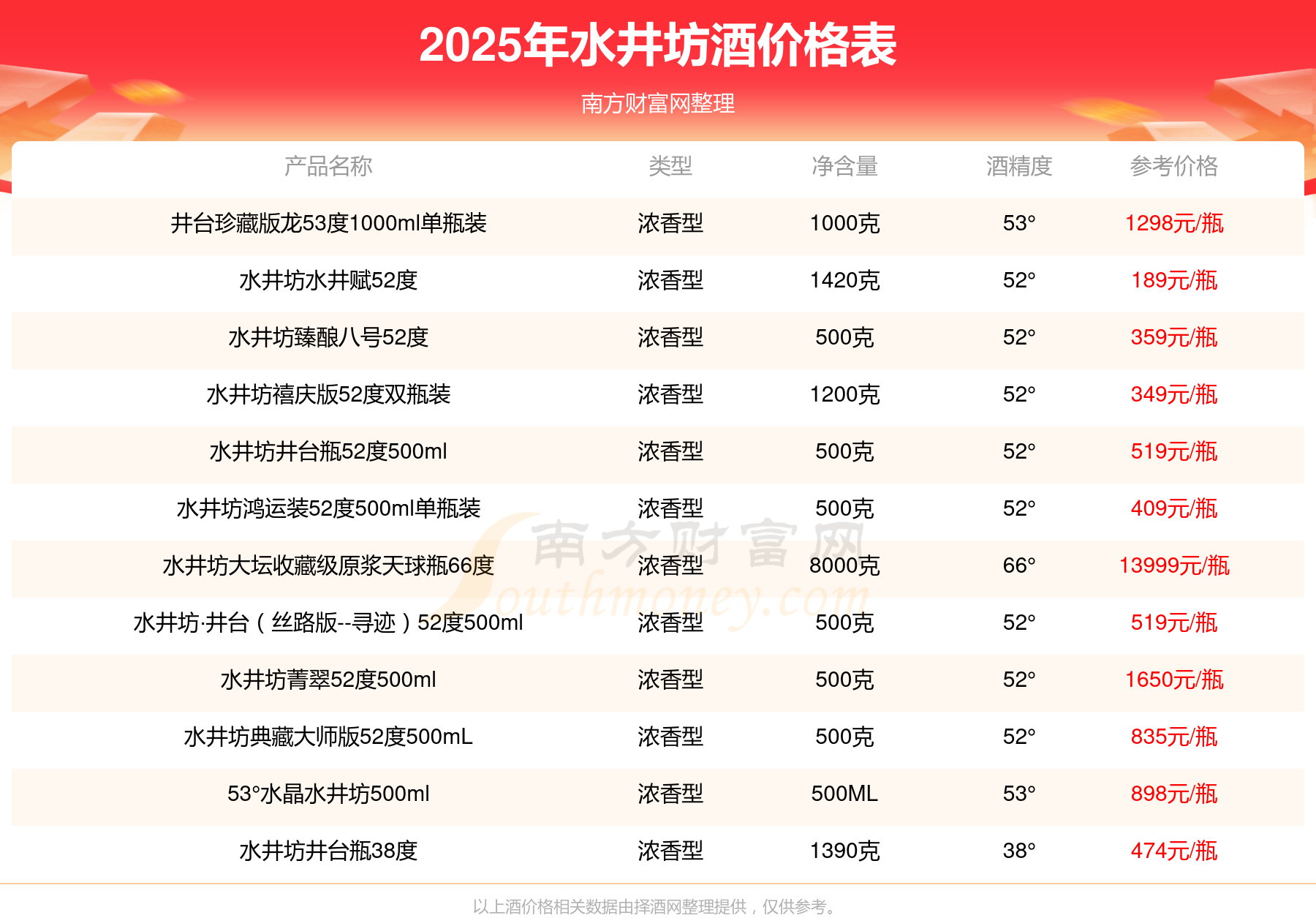 2025水井坊酒最新價格:水井坊大壇收藏級原漿天球瓶66度參考價13999元/瓶、水井坊博物館壹號53度雙瓶裝參考價10988元/瓶、53°水井坊公元十三600ml參考價2580元/瓶、水井坊梅蘭竹菊52度濃香型600ml4瓶參考價1999元/瓶、水井坊菁翠52度500ml參考價1650元/瓶、井臺珍藏版龍53度1000ml單瓶裝參考價1298元/瓶。