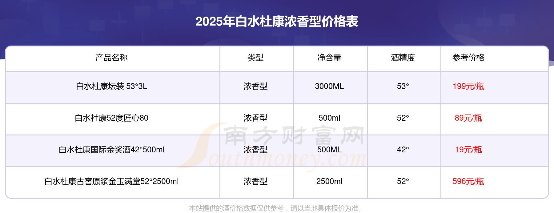 2025年白水杜康濃香型酒白水杜康古窖原漿金玉滿堂52°2500ml、白水杜康壇裝 53°3L、白水杜康52度匠心80、白水杜康國際金獎酒42°500ml等最新價格如下:白水杜康古窖原漿金玉滿堂52°2500ml參考價596元/瓶、白水杜康壇裝 53°3L參考價199元/瓶、白水杜康52度匠心80參考價89元/瓶、白水杜康國際金獎酒42°500ml參考價19元/瓶。