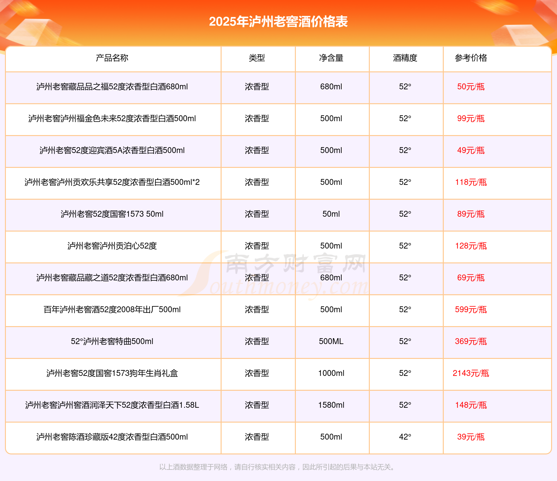 瀘州老窖酒最新價(jià)格2025:瀘州老窖國(guó)窖1573春釀鼠兆豐年E 55度參考價(jià)17999元/瓶、瀘州老窖國(guó)窖1573生命中的那壇酒55度014參考價(jià)9999元/瓶、瀘州老窖國(guó)窖1573春釀鼠兆豐年A 55度參考價(jià)5088元/瓶、瀘州老窖國(guó)窖1573生命中的那壇酒55度013濃香型白酒1000ml參考價(jià)4988元/瓶、瀘州老窖國(guó)窖1573生命中的那壇酒55度009 1000ml參考價(jià)4288元/瓶。