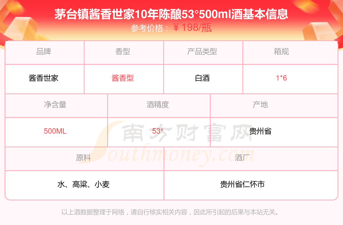 茅臺鎮(zhèn)醬香世家10年陳釀53°500ml基本信息