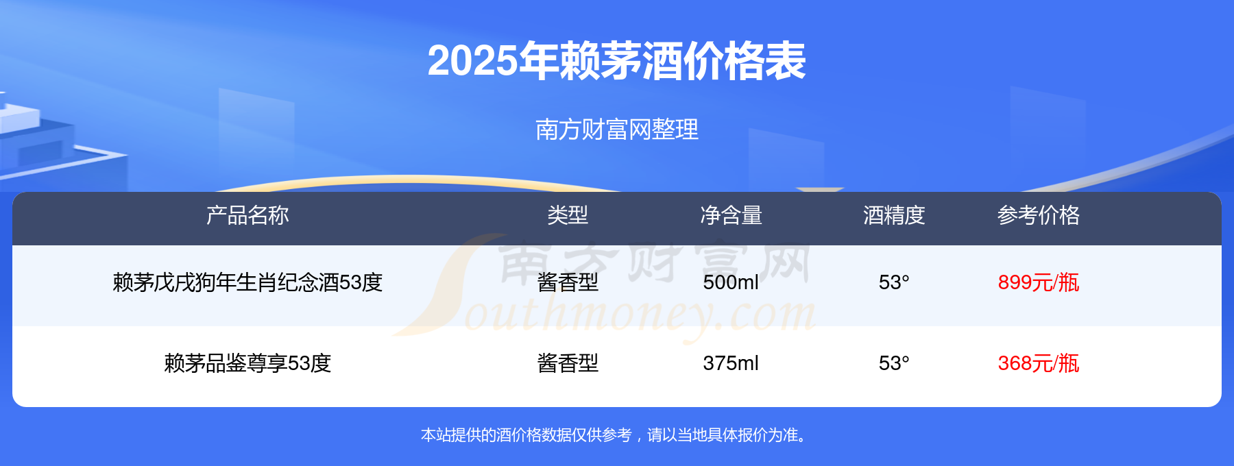 2025賴茅酒最新價格:賴茅戊戌狗年生肖紀(jì)念酒53度參考價899元/瓶、賴茅品鑒尊享53度參考價368元/瓶。