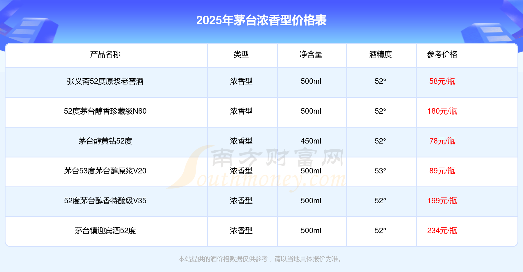 2025年,茅臺濃香型酒價格最高的是茅臺鎮(zhèn)迎賓酒52度,參考價234元,最低的是張義齋52度原漿老窖酒,參考價58元,價格高低差為176元。