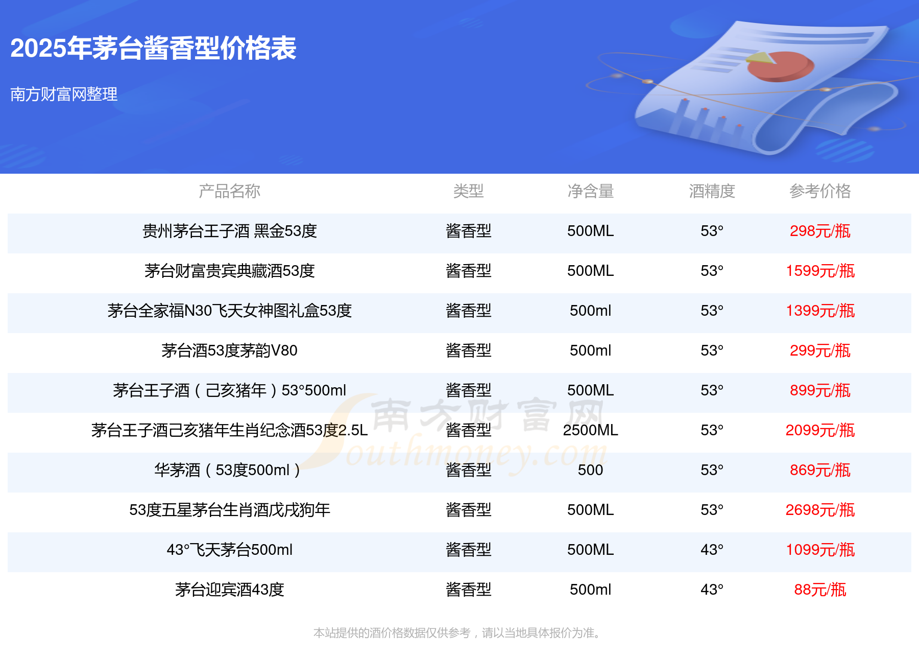 2025年茅臺醬香型酒華茅鑒藏 醬香型白酒 3L 53°、53度五星茅臺生肖酒丁酉雞年、貴州茅臺己亥豬年生肖酒53°500ml、53度五星茅臺生肖酒戊戌狗年等最新價格如下: