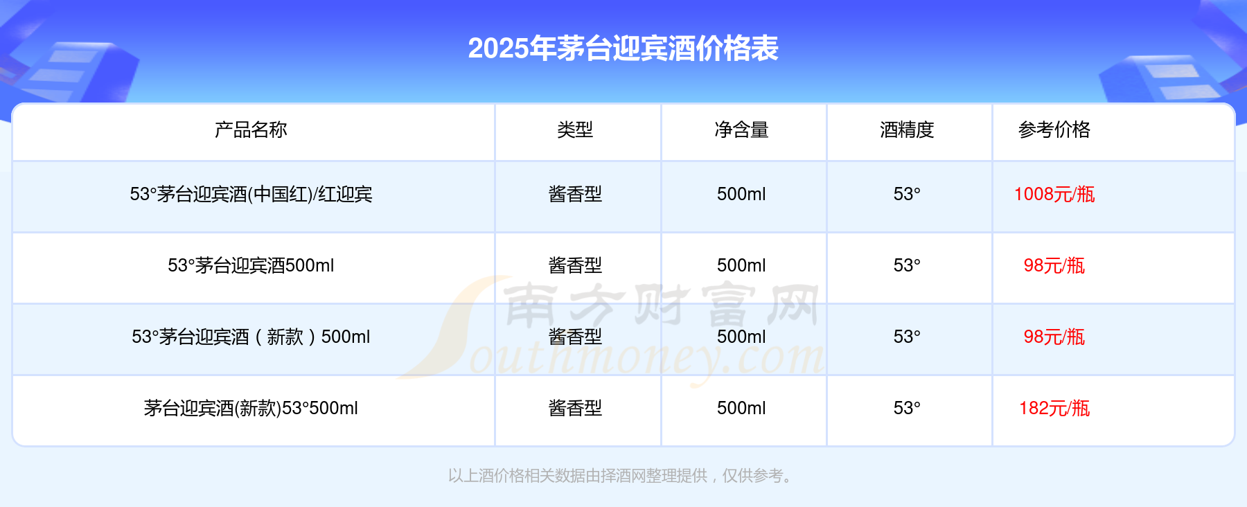 2025年,53°茅臺(tái)迎賓酒(中國紅)/紅迎賓、茅臺(tái)迎賓酒(新款)53°500ml、53°茅臺(tái)迎賓酒(新款)500ml等茅臺(tái)迎賓酒價(jià)格如下:53°茅臺(tái)迎賓酒(中國紅)/紅迎賓參考價(jià)1008元/瓶、茅臺(tái)迎賓酒(新款)53°500ml參考價(jià)182元/瓶、53°茅臺(tái)迎賓酒(新款)500ml參考價(jià)98元/瓶。
