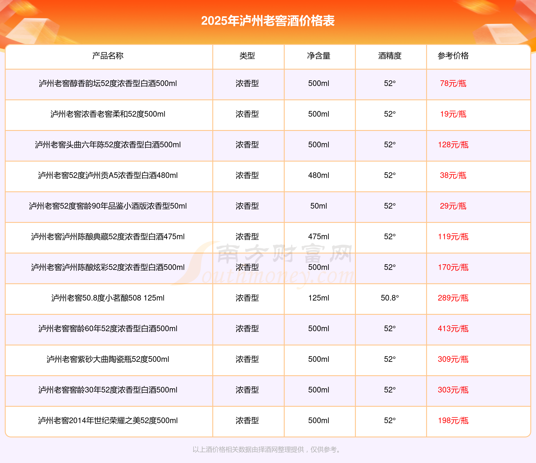 2025年,瀘州老窖國窖1573春釀鼠兆豐年E 55度、瀘州老窖國窖1573生命中的那壇酒55度014、瀘州老窖國窖1573春釀鼠兆豐年A 55度、瀘州老窖國窖1573生命中的那壇酒55度013濃香型白酒1000ml等瀘州老窖酒價格如下:瀘州老窖國窖1573春釀鼠兆豐年E 55度參考價17999元/瓶、瀘州老窖國窖1573生命中的那壇酒55度014參考價9999元/瓶、瀘州老窖國窖1573春釀鼠兆豐年A 55度參考價5088元/瓶、瀘州老窖國窖1573生命中的那壇酒55度013濃香型白酒1000ml參考價4988元/瓶。