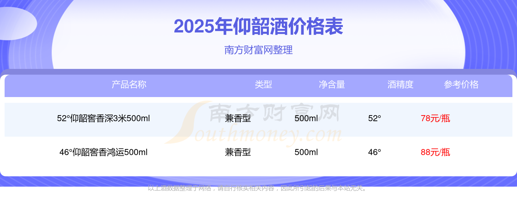 2025年仰韶價(jià)格最高的酒是46°仰韶窖香鴻運(yùn)500ml,參考價(jià)88元/瓶,最低的是52°仰韶窖香深3米500ml,參考價(jià)78元/瓶,價(jià)格高低差為10元/瓶。