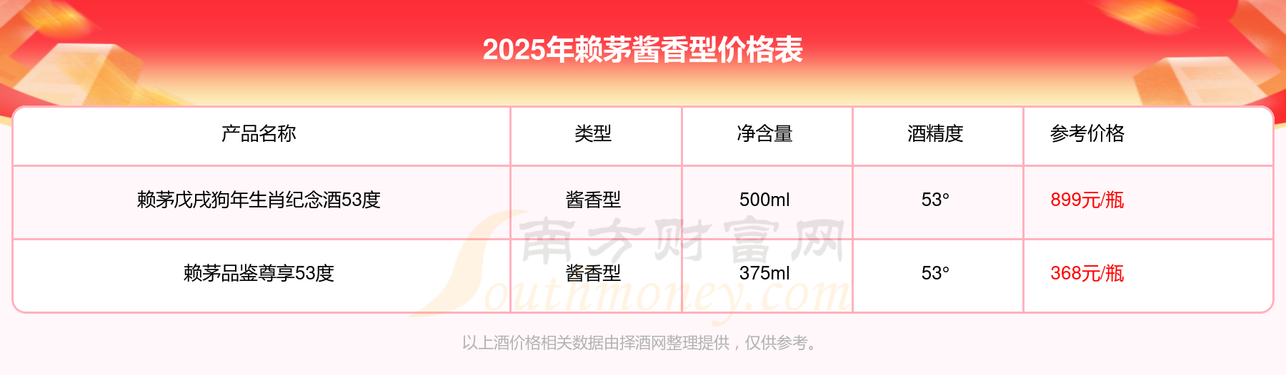賴茅醬香型酒最新價格2025:賴茅戊戌狗年生肖紀念酒53度參考價899元/瓶、賴茅品鑒尊享53度參考價368元/瓶。