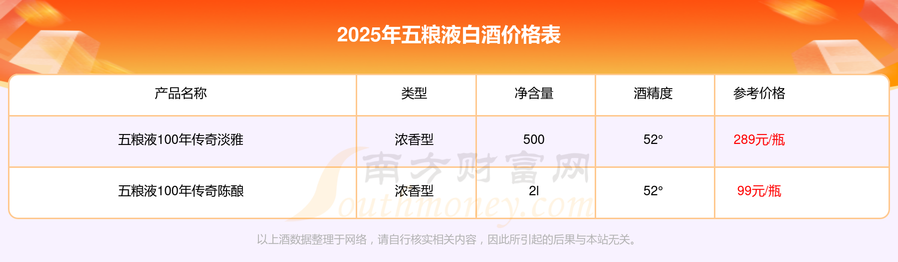 五糧液100年傳奇淡雅參考價289元/瓶、五糧液100年傳奇陳釀參考價99元/瓶。