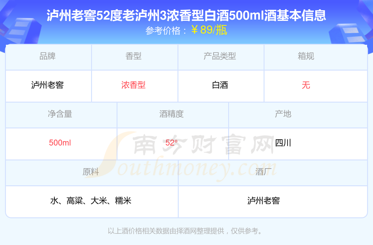 瀘州老窖52度老瀘州3濃香型白酒500ml基本信息