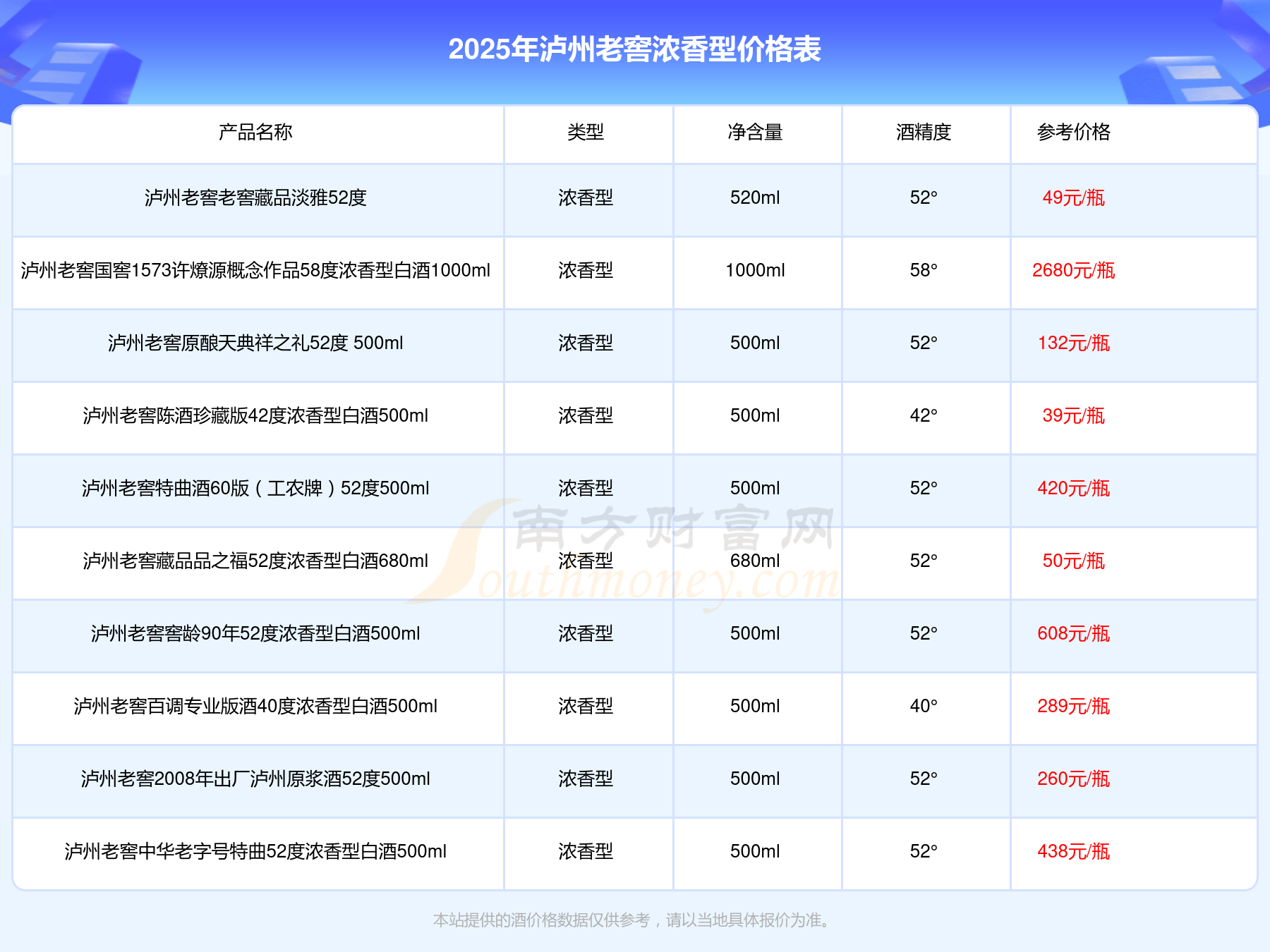 2025瀘州老窖濃香型酒最新價格:瀘州老窖國窖1573春釀鼠兆豐年E 55度參考價17999元/瓶、瀘州老窖國窖1573生命中的那壇酒55度014參考價9999元/瓶、瀘州老窖國窖1573春釀鼠兆豐年A 55度參考價5088元/瓶。