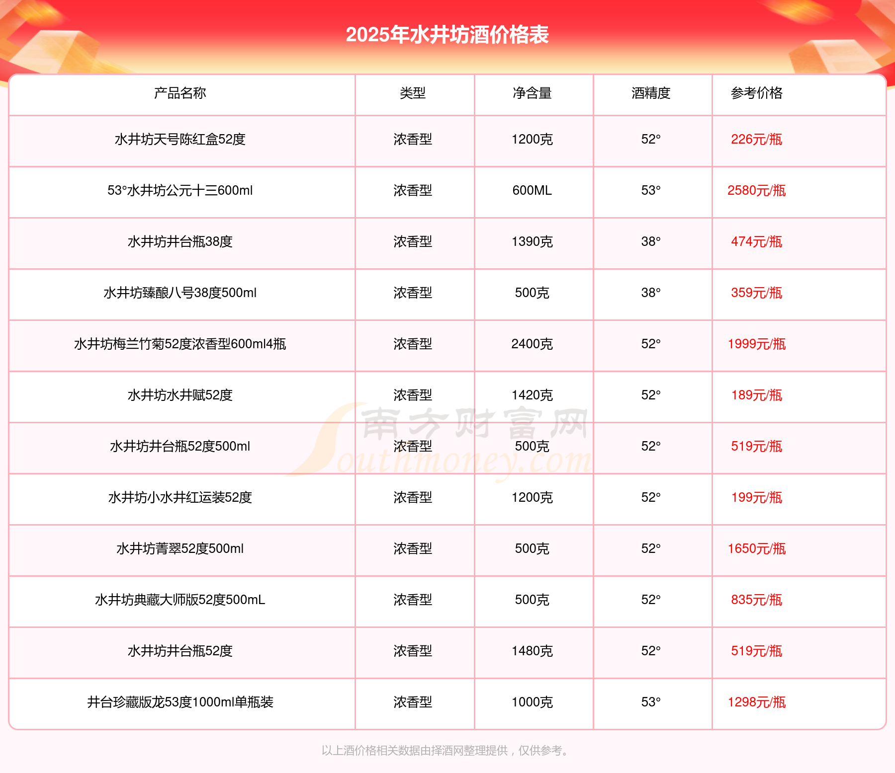 2025年,水井坊酒價(jià)格最高的是水井坊大壇收藏級原漿天球瓶66度,參考價(jià)13999元,最低的是水井坊小水井52度500ml,參考價(jià)158元,價(jià)格高低差為13841元。