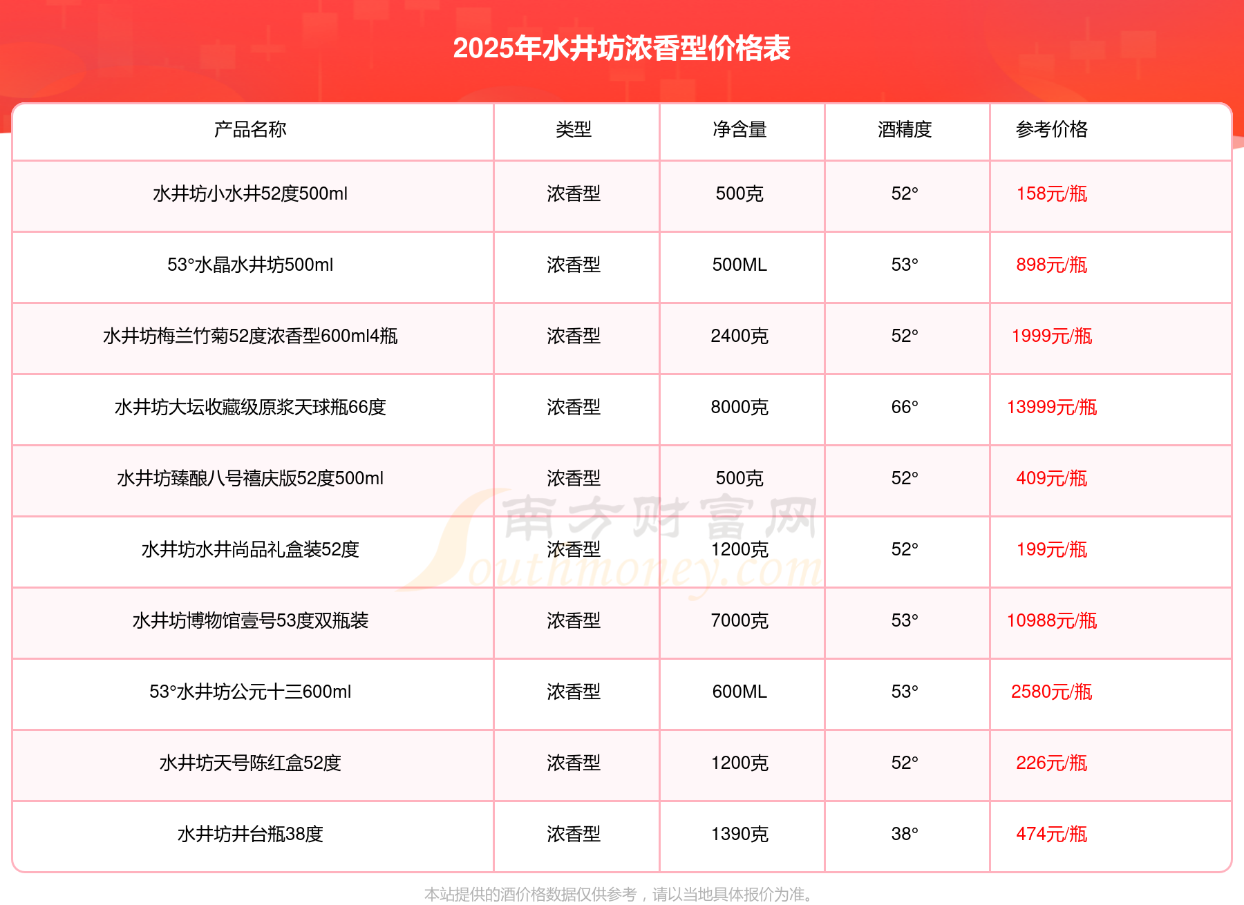2025年,水井坊大壇收藏級原漿天球瓶66度、水井坊博物館壹號53度雙瓶裝、53°水井坊公元十三600ml、水井坊梅蘭竹菊52度濃香型600ml4瓶、水井坊菁翠52度500ml等水井坊濃香型酒價格如下: