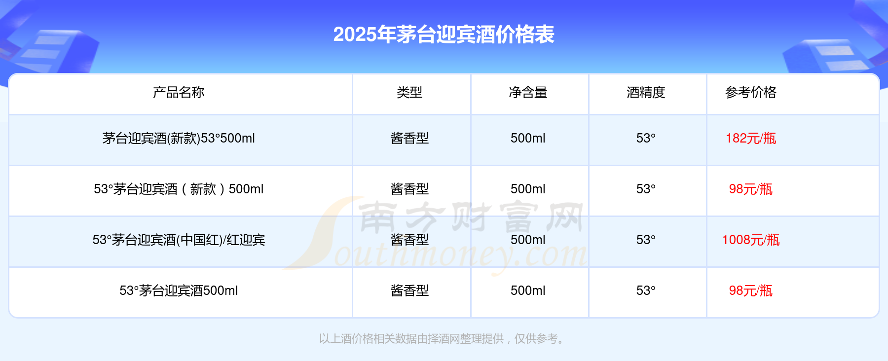 2025茅臺迎賓酒最新價格:53°茅臺迎賓酒(中國紅)/紅迎賓參考價1008元/瓶、茅臺迎賓酒(新款)53°500ml參考價182元/瓶、53°茅臺迎賓酒(新款)500ml參考價98元/瓶、53°茅臺迎賓酒500ml參考價98元/瓶。