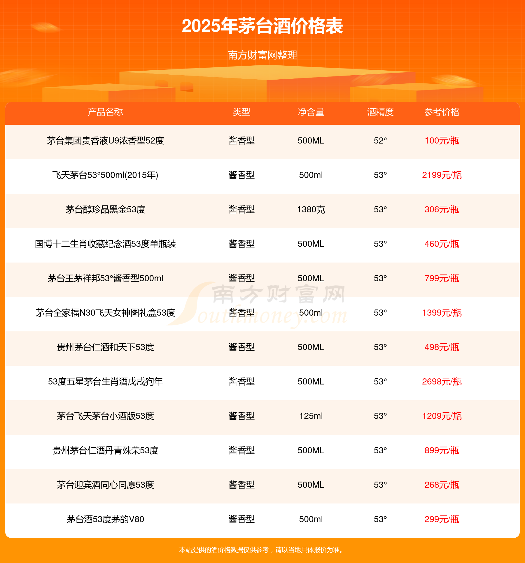 2025年,華茅鑒藏 醬香型白酒 3L 53°、53度五星茅臺生肖酒丁酉雞年、貴州茅臺己亥豬年生肖酒53°500ml、53度五星茅臺生肖酒戊戌狗年等茅臺酒價格如下:華茅鑒藏 醬香型白酒 3L 53°參考價8388元/瓶、53度五星茅臺生肖酒丁酉雞年參考價2798元/瓶、貴州茅臺己亥豬年生肖酒53°500ml參考價2699元/瓶、53度五星茅臺生肖酒戊戌狗年參考價2698元/瓶。