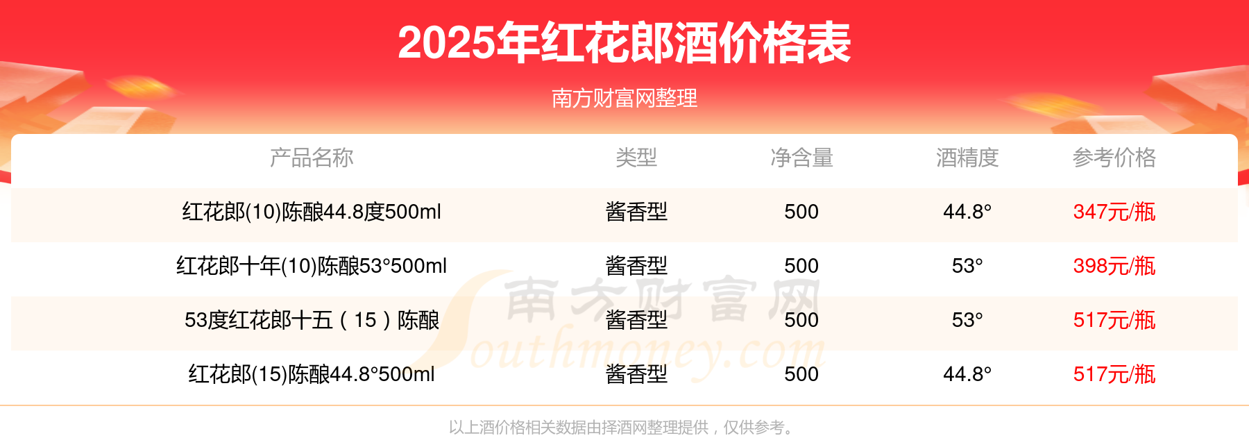 紅花郎酒最新價格2025:53度紅花郎十五(15)陳釀參考價517元/瓶、紅花郎(15)陳釀44.8°500ml參考價517元/瓶、紅花郎十年(10)陳釀53°500ml參考價398元/瓶、紅花郎(10)陳釀44.8度500ml參考價347元/瓶。