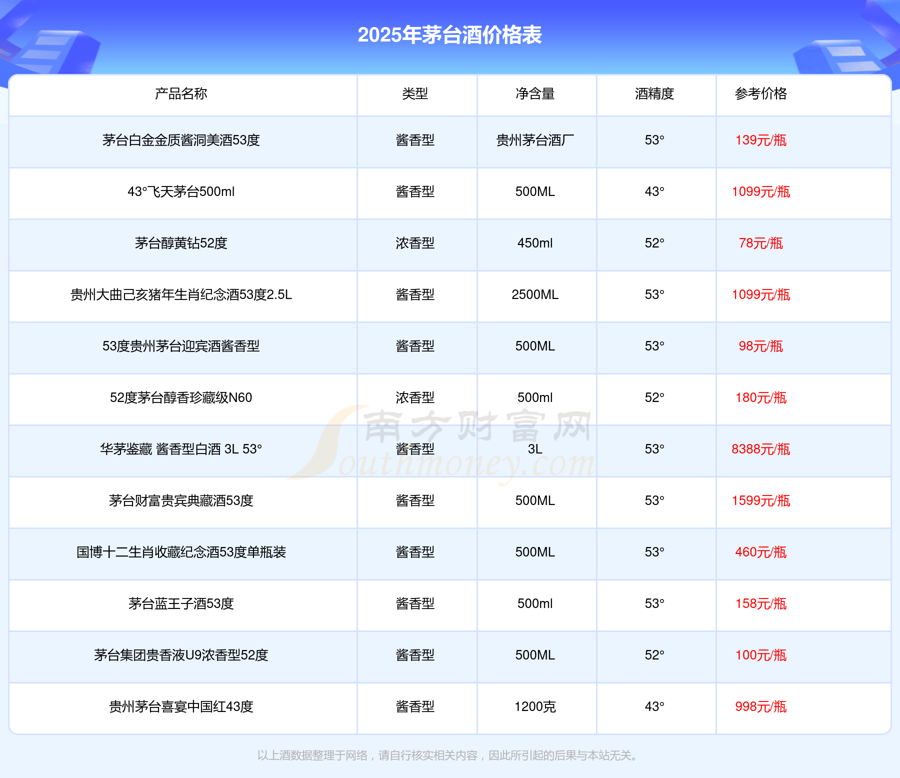 2025茅臺(tái)酒最新價(jià)格:華茅鑒藏 醬香型白酒 3L 53°參考價(jià)8388元/瓶、53度五星茅臺(tái)生肖酒丁酉雞年參考價(jià)2798元/瓶、貴州茅臺(tái)己亥豬年生肖酒53°500ml參考價(jià)2699元/瓶、53度五星茅臺(tái)生肖酒戊戌狗年參考價(jià)2698元/瓶、飛天茅臺(tái)53°500ml(2015年)參考價(jià)2199元/瓶、茅臺(tái)王子酒己亥豬年生肖紀(jì)念酒53度2.5L參考價(jià)2099元/瓶、茅臺(tái)1935醬香型53度參考價(jià)1799元/瓶、茅臺(tái)財(cái)富貴賓典藏酒53度參考價(jià)1599元/瓶。