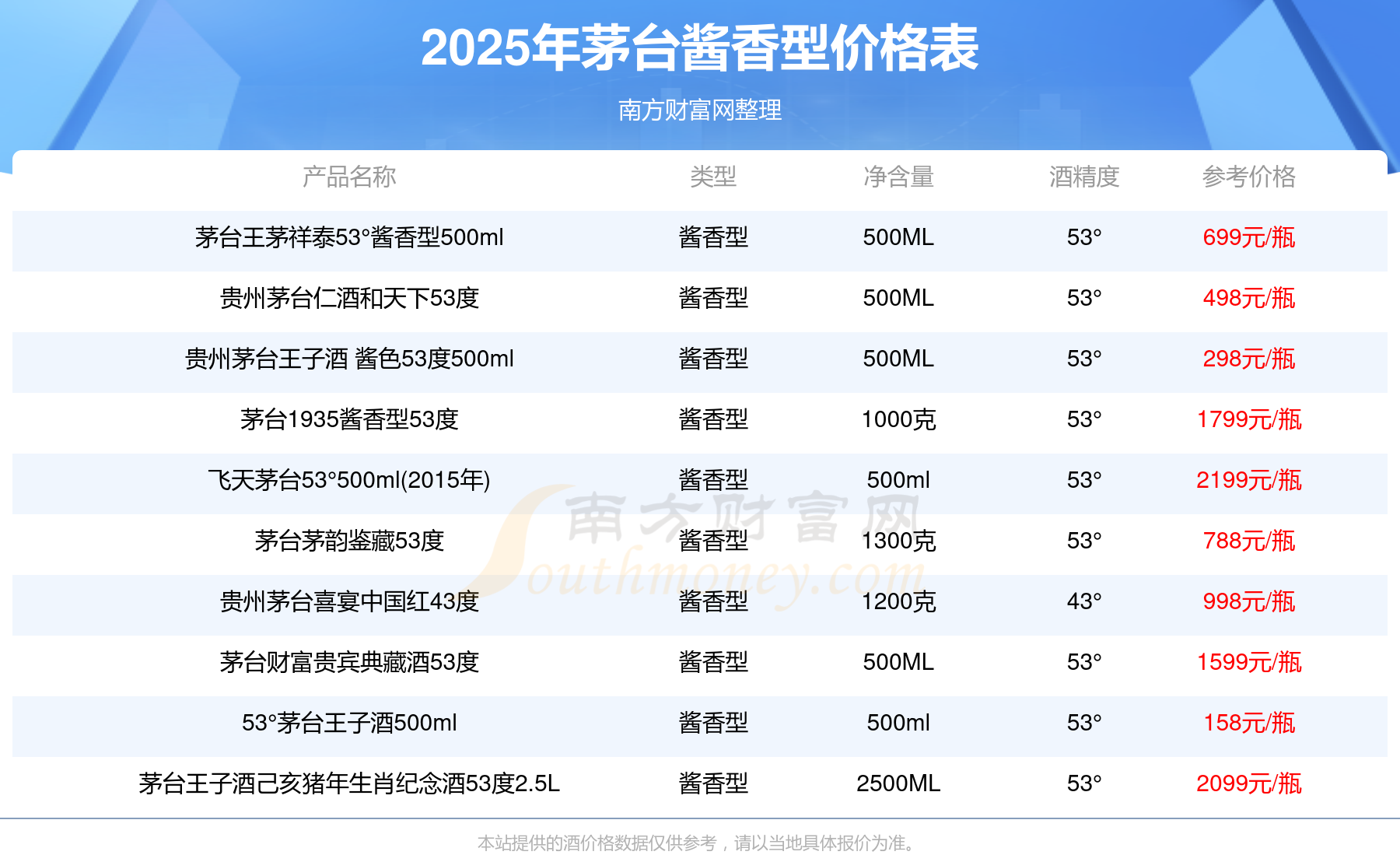 2025年茅臺(tái)醬香型酒華茅鑒藏 醬香型白酒 3L 53°、53度五星茅臺(tái)生肖酒丁酉雞年、貴州茅臺(tái)己亥豬年生肖酒53°500ml、53度五星茅臺(tái)生肖酒戊戌狗年、飛天茅臺(tái)53°500ml(2015年)等最新價(jià)格如下: