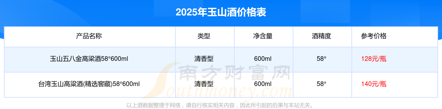 2025年玉山酒臺灣玉山高粱酒(精選窖藏)58°600ml、玉山五八金高梁酒58°600ml等最新價格如下:臺灣玉山高粱酒(精選窖藏)58°600ml參考價140元/瓶、玉山五八金高梁酒58°600ml參考價128元/瓶。