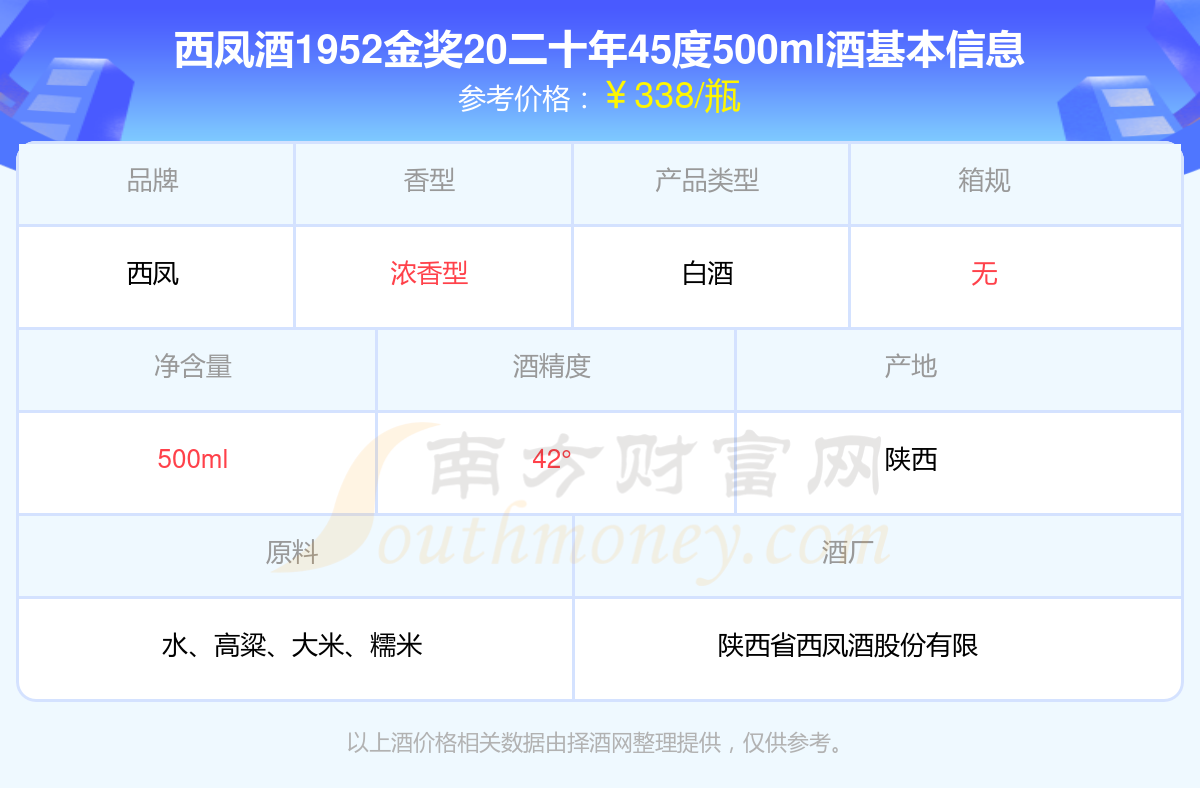 西鳳酒1952金獎20二十年45度500ml基本信息