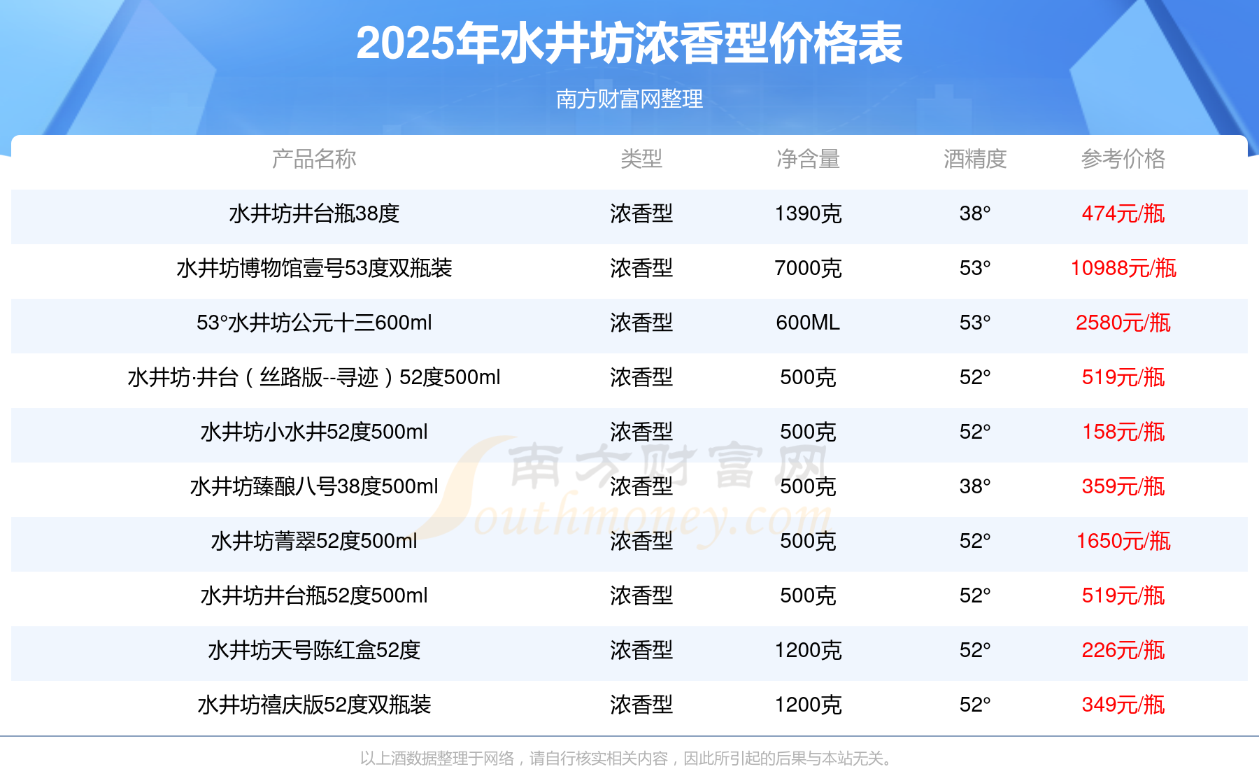 水井坊大壇收藏級(jí)原漿天球瓶66度參考價(jià)13999元/瓶、水井坊博物館壹號(hào)53度雙瓶裝參考價(jià)10988元/瓶、53°水井坊公元十三600ml參考價(jià)2580元/瓶。