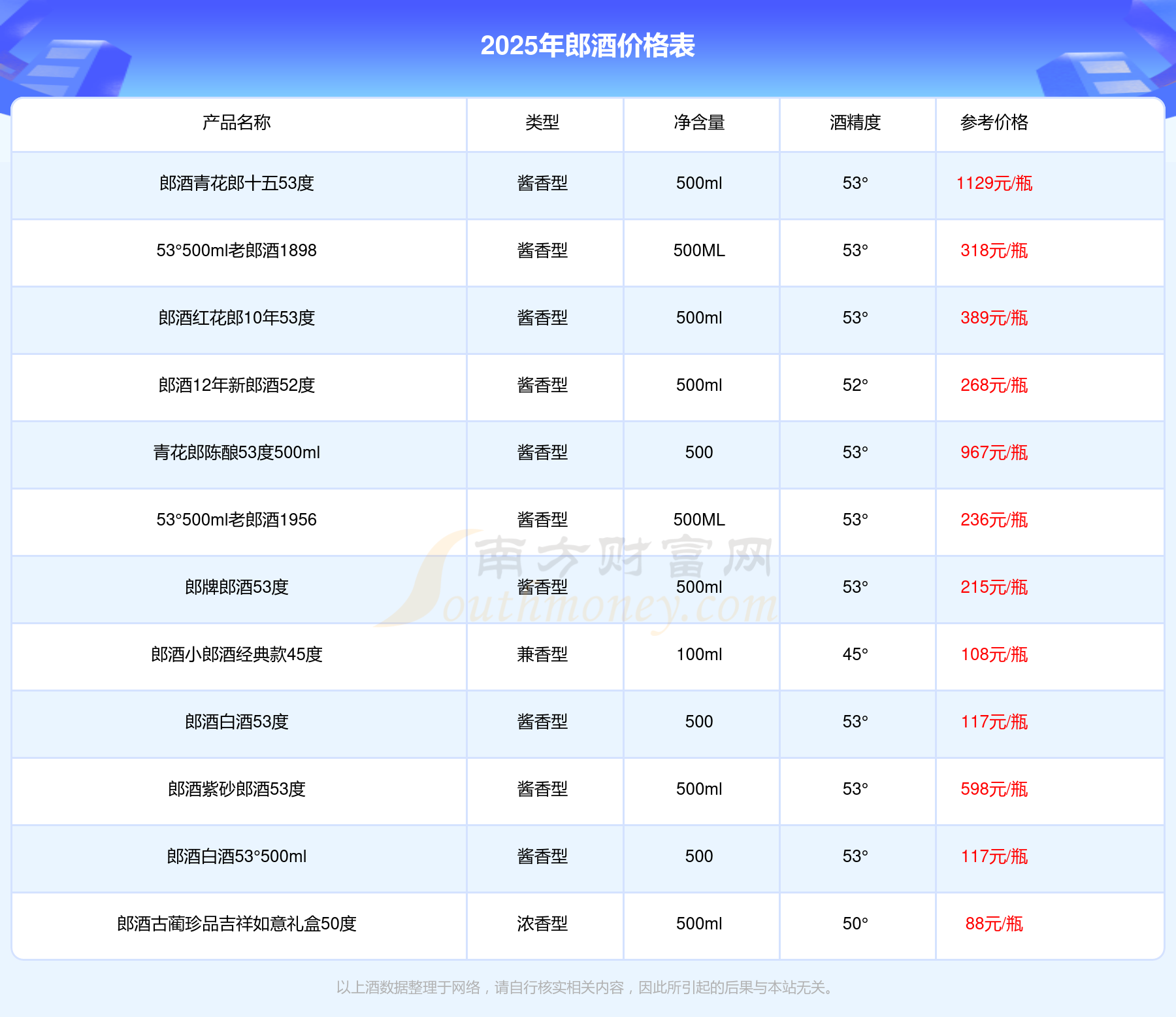 郎酒青花郎十五53度參考價(jià)1129元/瓶、青花郎陳釀53度500ml參考價(jià)967元/瓶、郎酒紫砂郎酒53度參考價(jià)598元/瓶、郎酒紅花郎10年53度參考價(jià)389元/瓶、53°500ml老郎酒1898參考價(jià)318元/瓶。