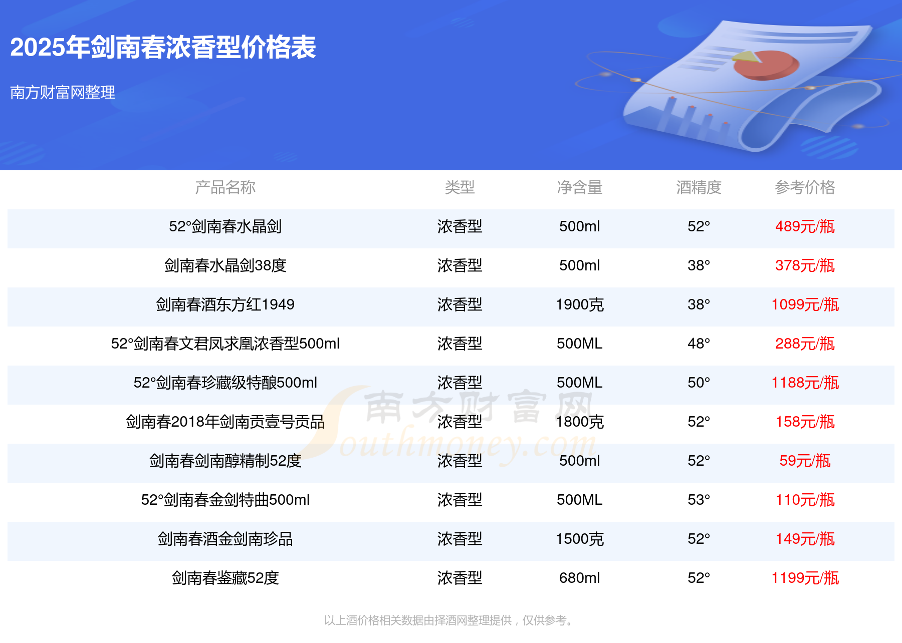 2025年,劍南春鑒藏52度、52°劍南春珍藏級(jí)特釀500ml、劍南春酒東方紅1949、52°劍南春500ml、52°劍南春水晶劍等劍南春濃香型酒價(jià)格如下: