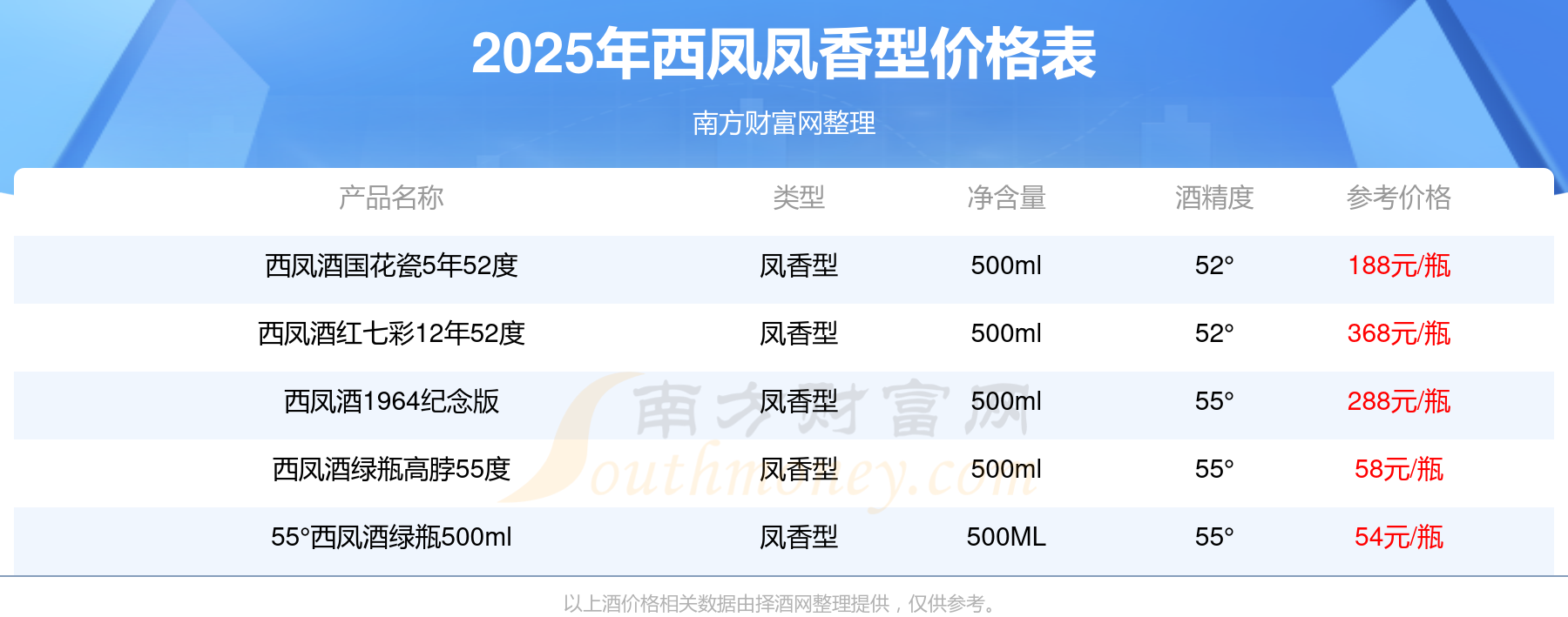 2025年西鳳鳳香型價格最高的酒是西鳳酒紅七彩12年52度,參考價368元/瓶,最低的是55°西鳳酒綠瓶500ml,參考價54元/瓶,價格高低差為314元/瓶。