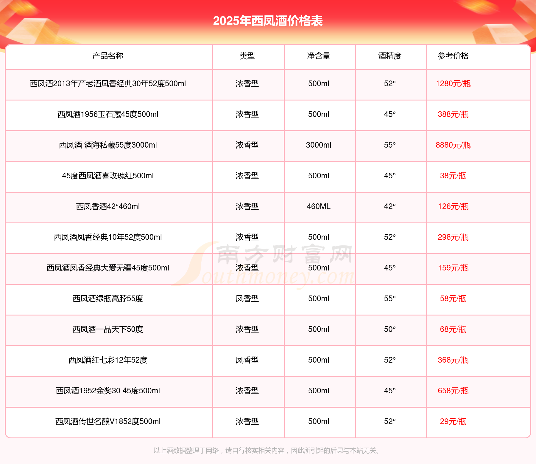 西鳳酒 酒海私藏55度3000ml參考價(jià)8880元/瓶、西鳳酒1952金獎(jiǎng)50 55度500ml參考價(jià)2380元/瓶、西鳳酒2013年產(chǎn)老酒鳳香經(jīng)典30年52度500ml參考價(jià)1280元/瓶、西鳳酒1956鉆石藏45度500ml參考價(jià)980元/瓶、西鳳酒1952金獎(jiǎng)30 55度500ml參考價(jià)898元/瓶、西鳳酒鳳香經(jīng)典20年52度500ml參考價(jià)768元/瓶。