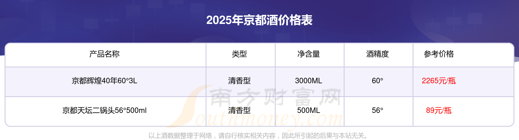 2025年京都酒京都輝煌40年60°3L、京都天壇二鍋頭56°500ml等最新價格如下:京都輝煌40年60°3L參考價2265元/瓶、京都天壇二鍋頭56°500ml參考價89元/瓶。