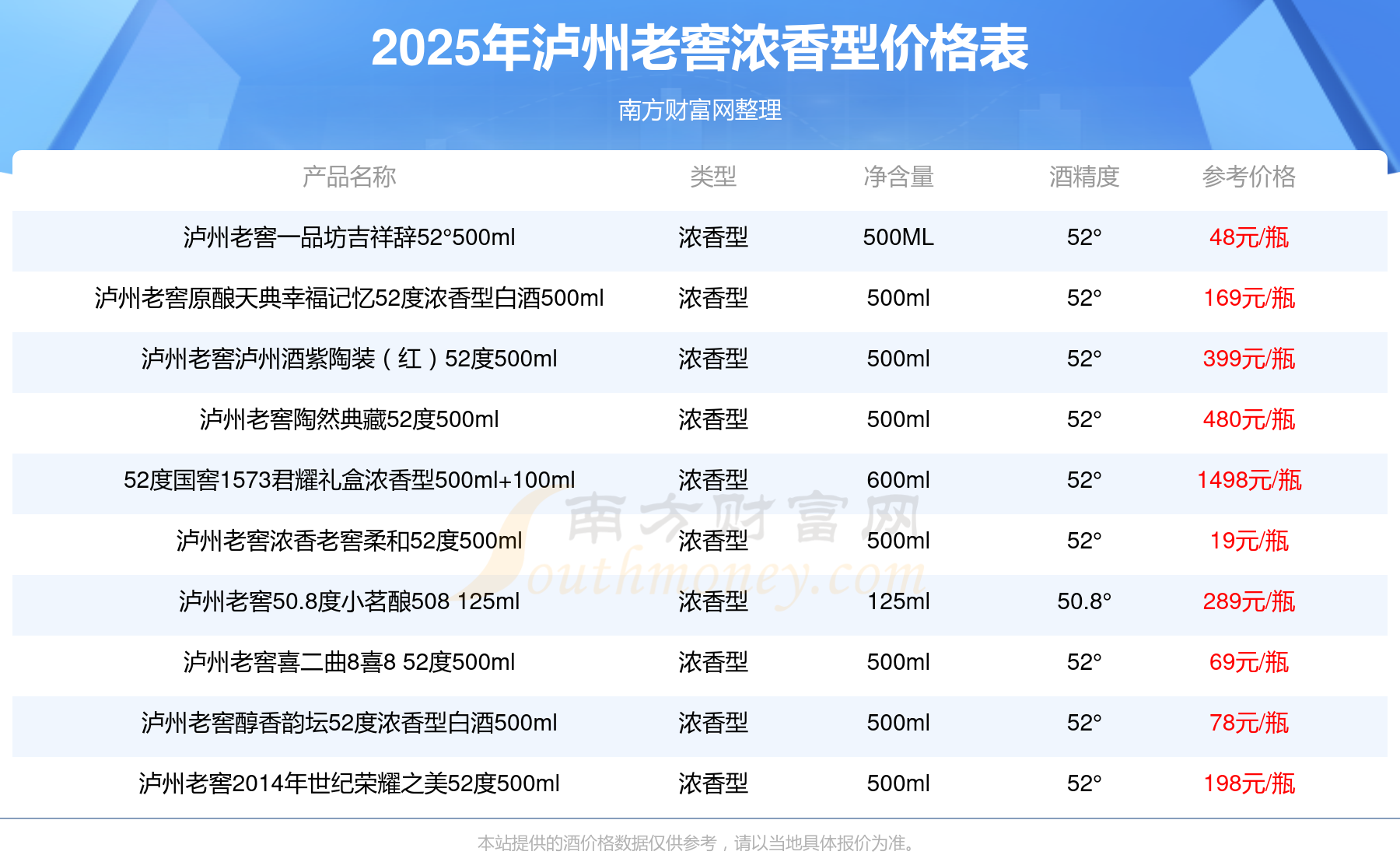 瀘州老窖濃香型酒最新價(jià)格2025:瀘州老窖國(guó)窖1573春釀鼠兆豐年E 55度參考價(jià)17999元/瓶、瀘州老窖國(guó)窖1573生命中的那壇酒55度014參考價(jià)9999元/瓶、瀘州老窖國(guó)窖1573春釀鼠兆豐年A 55度參考價(jià)5088元/瓶、瀘州老窖國(guó)窖1573生命中的那壇酒55度013濃香型白酒1000ml參考價(jià)4988元/瓶、瀘州老窖國(guó)窖1573生命中的那壇酒55度009 1000ml參考價(jià)4288元/瓶、瀘州老窖國(guó)窖1573中國(guó)品味52度濃香型白酒500ml參考價(jià)2888元/瓶、瀘州老窖國(guó)窖1573許燎源概念作品58度濃香型白酒1000ml參考價(jià)2680元/瓶。