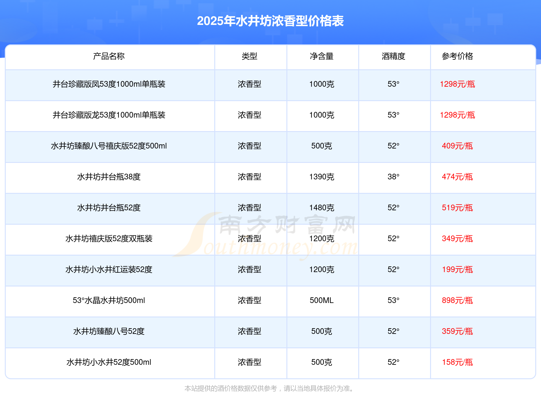 2025年水井坊濃香型酒水井坊大壇收藏級原漿天球瓶66度、水井坊博物館壹號53度雙瓶裝、53°水井坊公元十三600ml、水井坊梅蘭竹菊52度濃香型600ml4瓶、水井坊菁翠52度500ml、井臺珍藏版龍53度1000ml單瓶裝等最新價格如下:水井坊大壇收藏級原漿天球瓶66度參考價13999元/瓶、水井坊博物館壹號53度雙瓶裝參考價10988元/瓶、53°水井坊公元十三600ml參考價2580元/瓶、水井坊梅蘭竹菊52度濃香型600ml4瓶參考價1999元/瓶、水井坊菁翠52度500ml參考價1650元/瓶、井臺珍藏版龍53度1000ml單瓶裝參考價1298元/瓶。
