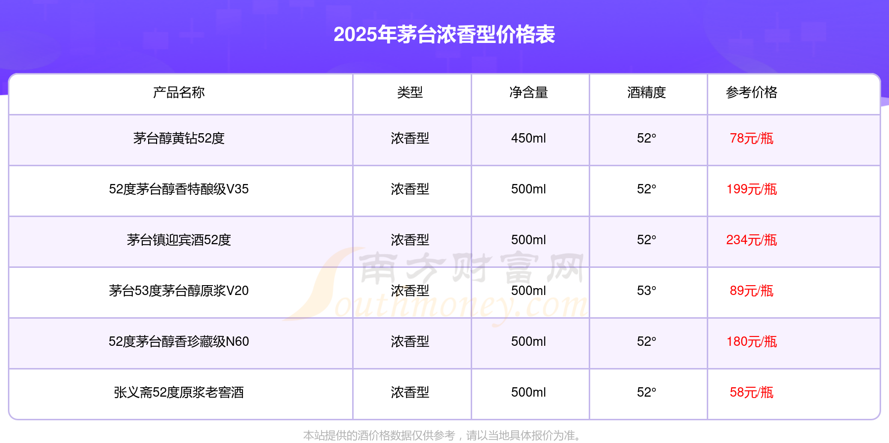 2025年,茅臺濃香型酒價格最高的是茅臺鎮(zhèn)迎賓酒52度,參考價234元,最低的是張義齋52度原漿老窖酒,參考價58元,價格高低差為176元。