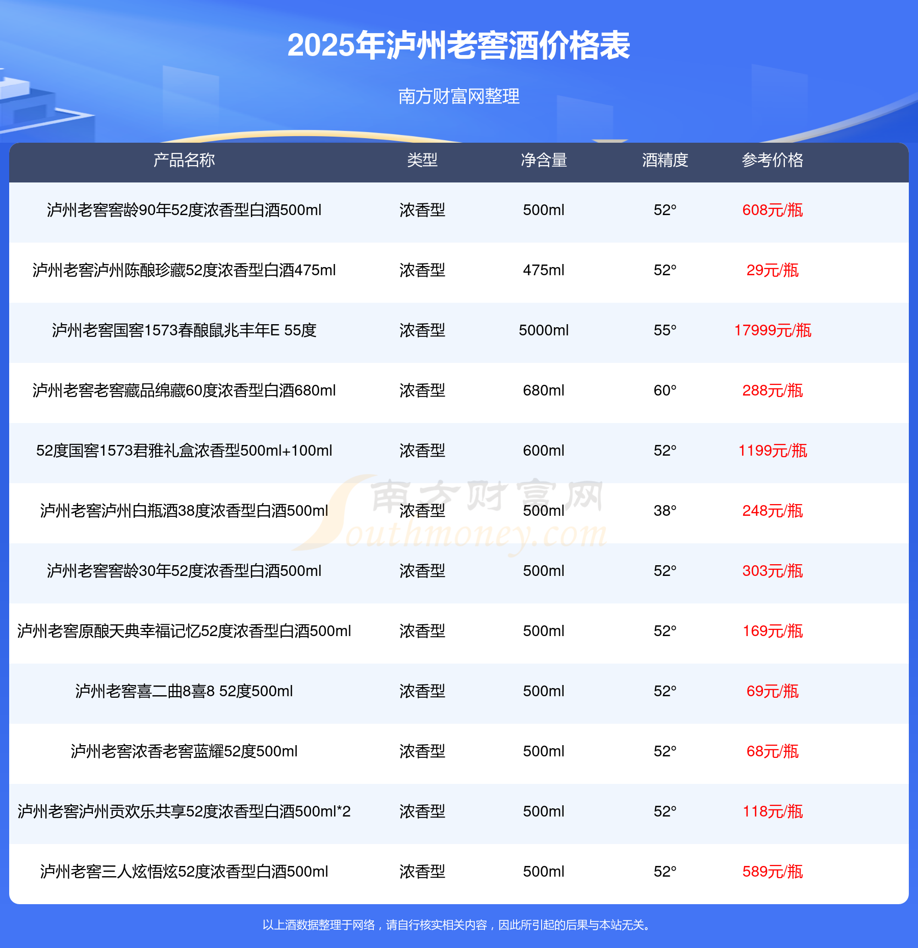 2025瀘州老窖酒最新價格:瀘州老窖國窖1573春釀鼠兆豐年E 55度參考價17999元/瓶、瀘州老窖國窖1573生命中的那壇酒55度014參考價9999元/瓶、瀘州老窖國窖1573春釀鼠兆豐年A 55度參考價5088元/瓶。
