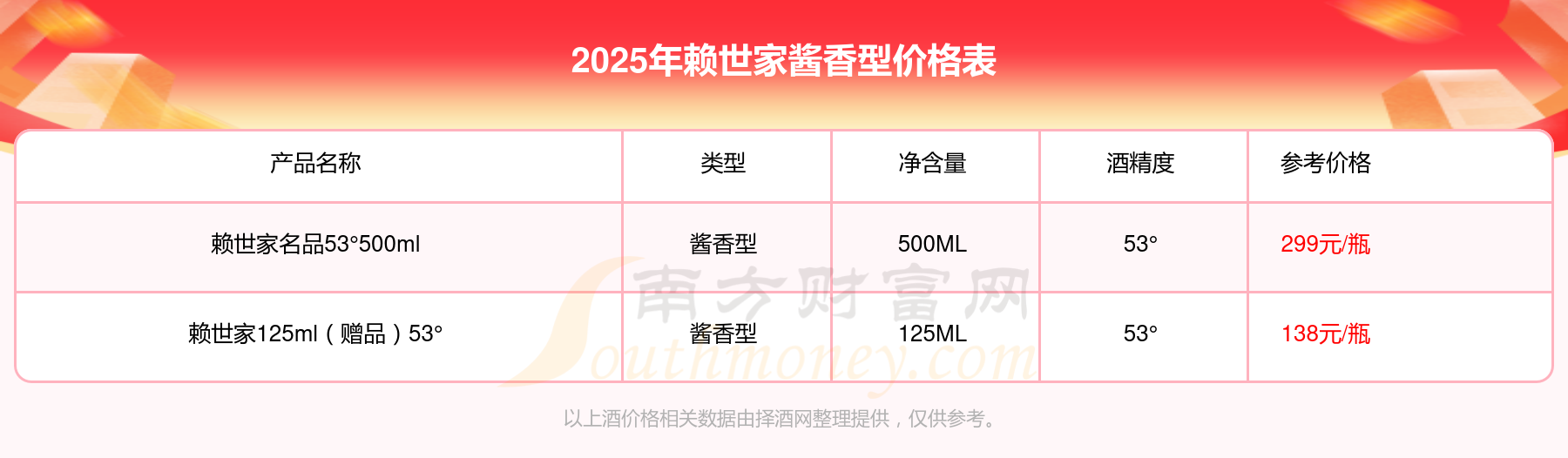賴世家名品53°500ml參考價(jià)299元/瓶、賴世家125ml(贈(zèng)品)53°參考價(jià)138元/瓶。