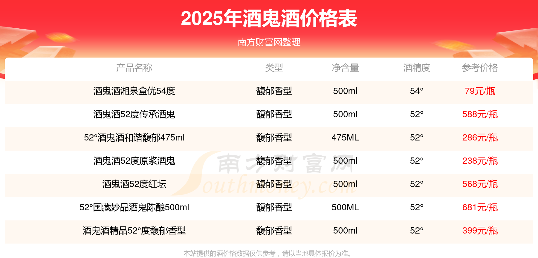 2025年酒鬼酒52°國藏妙品酒鬼陳釀500ml、酒鬼酒52度傳承酒鬼、酒鬼酒52度紅壇、酒鬼酒精品52°度馥郁香型、52°酒鬼酒和諧馥郁475ml、酒鬼酒52度原漿酒鬼、酒鬼酒湘泉盒優(yōu)54度等最新價格如下:52°國藏妙品酒鬼陳釀500ml參考價681元/瓶、酒鬼酒52度傳承酒鬼參考價588元/瓶、酒鬼酒52度紅壇參考價568元/瓶、酒鬼酒精品52°度馥郁香型參考價399元/瓶、52°酒鬼酒和諧馥郁475ml參考價286元/瓶、酒鬼酒52度原漿酒鬼參考價238元/瓶、酒鬼酒湘泉盒優(yōu)54度參考價79元/瓶。