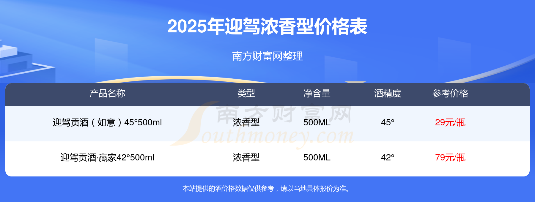 2025迎駕濃香型酒最新價格:迎駕貢酒·贏家42°500ml參考價79元/瓶、迎駕貢酒(如意)45°500ml參考價29元/瓶。