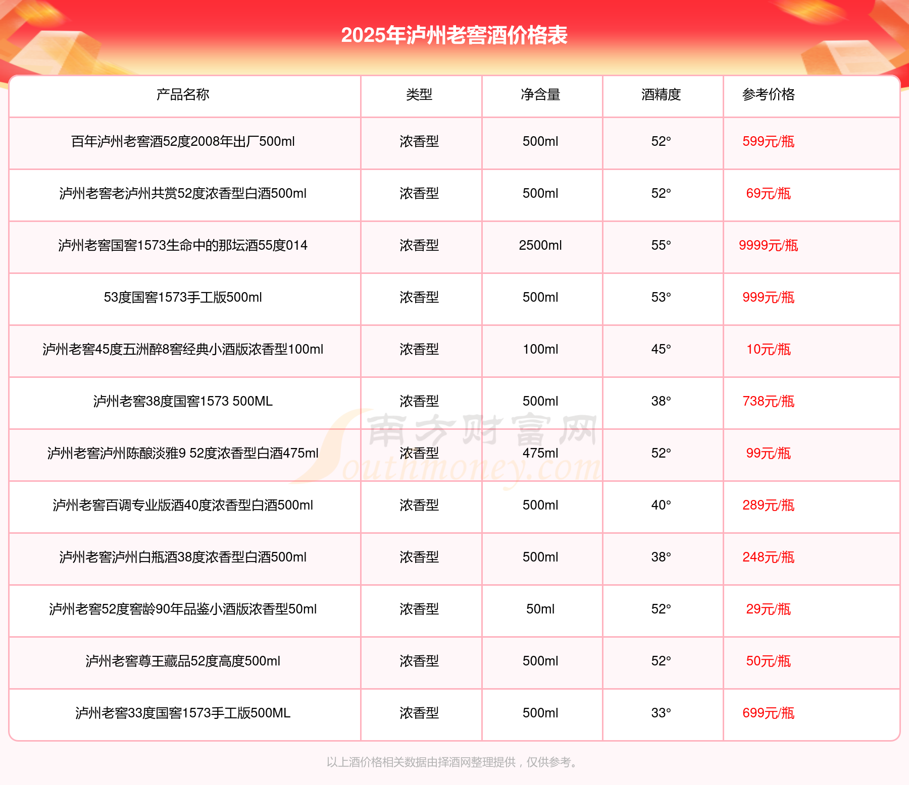 2025瀘州老窖酒最新價(jià)格:瀘州老窖國(guó)窖1573春釀鼠兆豐年E 55度參考價(jià)17999元/瓶、瀘州老窖國(guó)窖1573生命中的那壇酒55度014參考價(jià)9999元/瓶、瀘州老窖國(guó)窖1573春釀鼠兆豐年A 55度參考價(jià)5088元/瓶、瀘州老窖國(guó)窖1573生命中的那壇酒55度013濃香型白酒1000ml參考價(jià)4988元/瓶、瀘州老窖國(guó)窖1573生命中的那壇酒55度009 1000ml參考價(jià)4288元/瓶、瀘州老窖國(guó)窖1573中國(guó)品味52度濃香型白酒500ml參考價(jià)2888元/瓶。
