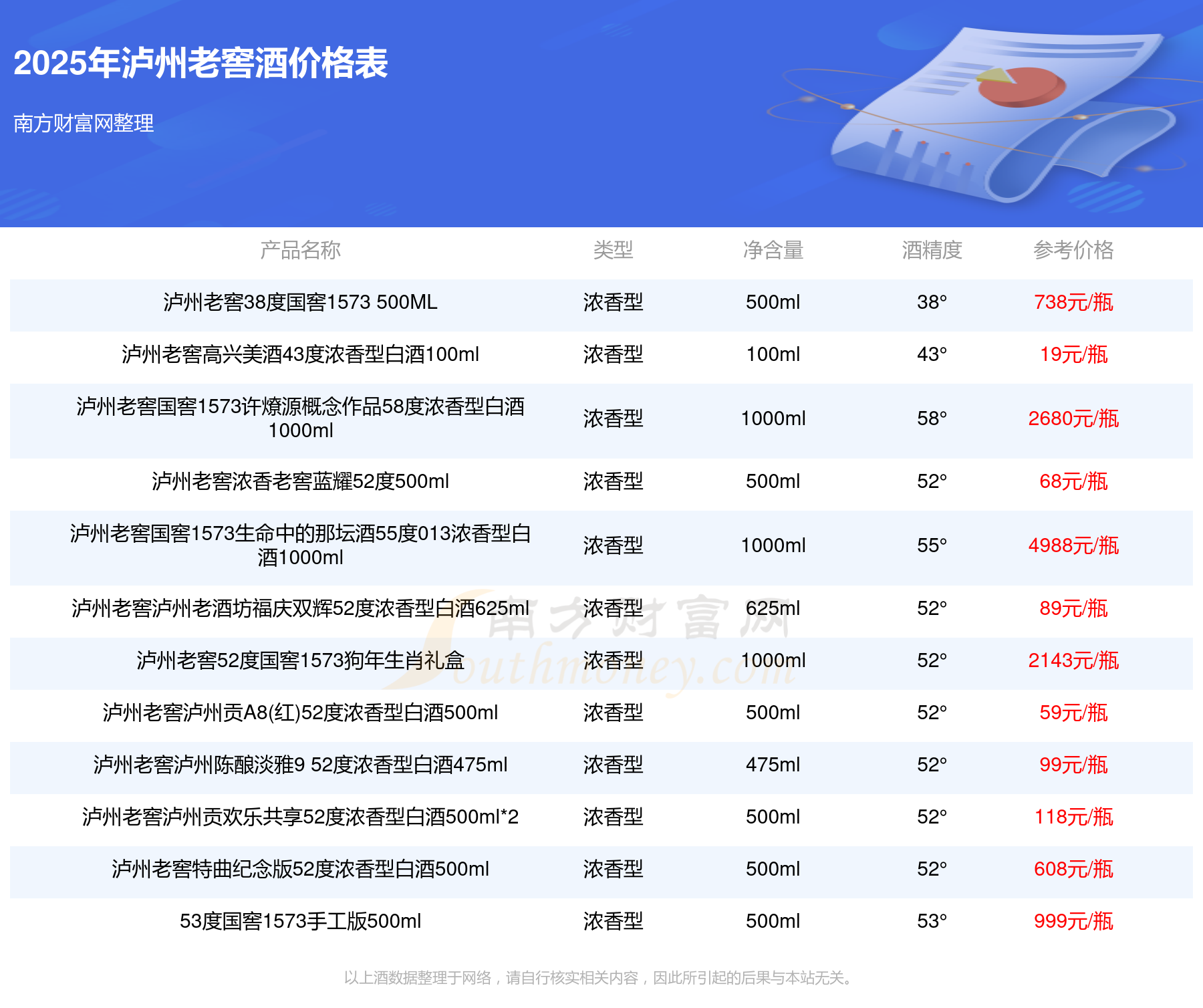 瀘州老窖國窖1573春釀鼠兆豐年E 55度參考價17999元/瓶、瀘州老窖國窖1573生命中的那壇酒55度014參考價9999元/瓶、瀘州老窖國窖1573春釀鼠兆豐年A 55度參考價5088元/瓶、瀘州老窖國窖1573生命中的那壇酒55度013濃香型白酒1000ml參考價4988元/瓶、瀘州老窖國窖1573生命中的那壇酒55度009 1000ml參考價4288元/瓶。
