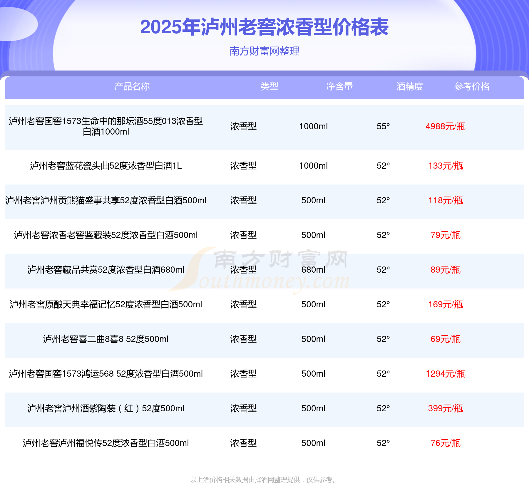 2025年,瀘州老窖濃香型酒價格最高的是瀘州老窖國窖1573春釀鼠兆豐年E 55度,參考價17999元,最低的是瀘州老窖45度五洲醉8窖經(jīng)典小酒版濃香型100ml,參考價10元,價格高低差為17989元。