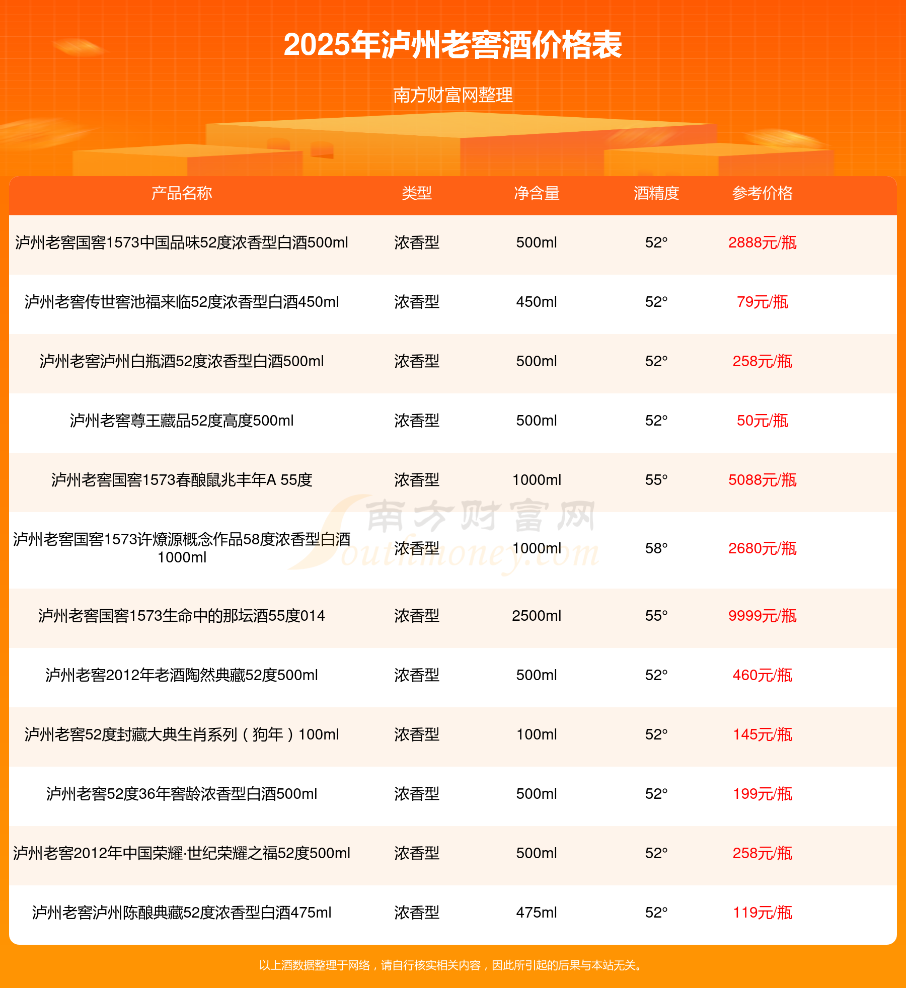 2025年,瀘州老窖國窖1573春釀鼠兆豐年E 55度、瀘州老窖國窖1573生命中的那壇酒55度014、瀘州老窖國窖1573春釀鼠兆豐年A 55度、瀘州老窖國窖1573生命中的那壇酒55度013濃香型白酒1000ml、瀘州老窖國窖1573生命中的那壇酒55度009 1000ml、瀘州老窖國窖1573中國品味52度濃香型白酒500ml等瀘州老窖酒價格如下: