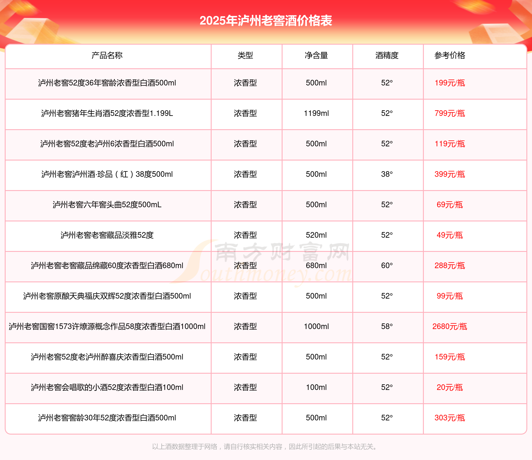 2025瀘州老窖酒最新價格:瀘州老窖國窖1573春釀鼠兆豐年E 55度參考價17999元/瓶、瀘州老窖國窖1573生命中的那壇酒55度014參考價9999元/瓶、瀘州老窖國窖1573春釀鼠兆豐年A 55度參考價5088元/瓶、瀘州老窖國窖1573生命中的那壇酒55度013濃香型白酒1000ml參考價4988元/瓶、瀘州老窖國窖1573生命中的那壇酒55度009 1000ml參考價4288元/瓶、瀘州老窖國窖1573中國品味52度濃香型白酒500ml參考價2888元/瓶。