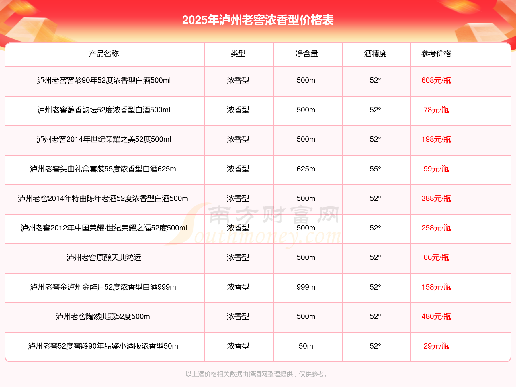 2025年瀘州老窖濃香型酒瀘州老窖國(guó)窖1573春釀鼠兆豐年E 55度、瀘州老窖國(guó)窖1573生命中的那壇酒55度014、瀘州老窖國(guó)窖1573春釀鼠兆豐年A 55度、瀘州老窖國(guó)窖1573生命中的那壇酒55度013濃香型白酒1000ml、瀘州老窖國(guó)窖1573生命中的那壇酒55度009 1000ml、瀘州老窖國(guó)窖1573中國(guó)品味52度濃香型白酒500ml等最新價(jià)格如下:瀘州老窖國(guó)窖1573春釀鼠兆豐年E 55度參考價(jià)17999元/瓶、瀘州老窖國(guó)窖1573生命中的那壇酒55度014參考價(jià)9999元/瓶、瀘州老窖國(guó)窖1573春釀鼠兆豐年A 55度參考價(jià)5088元/瓶、瀘州老窖國(guó)窖1573生命中的那壇酒55度013濃香型白酒1000ml參考價(jià)4988元/瓶、瀘州老窖國(guó)窖1573生命中的那壇酒55度009 1000ml參考價(jià)4288元/瓶、瀘州老窖國(guó)窖1573中國(guó)品味52度濃香型白酒500ml參考價(jià)2888元/瓶。