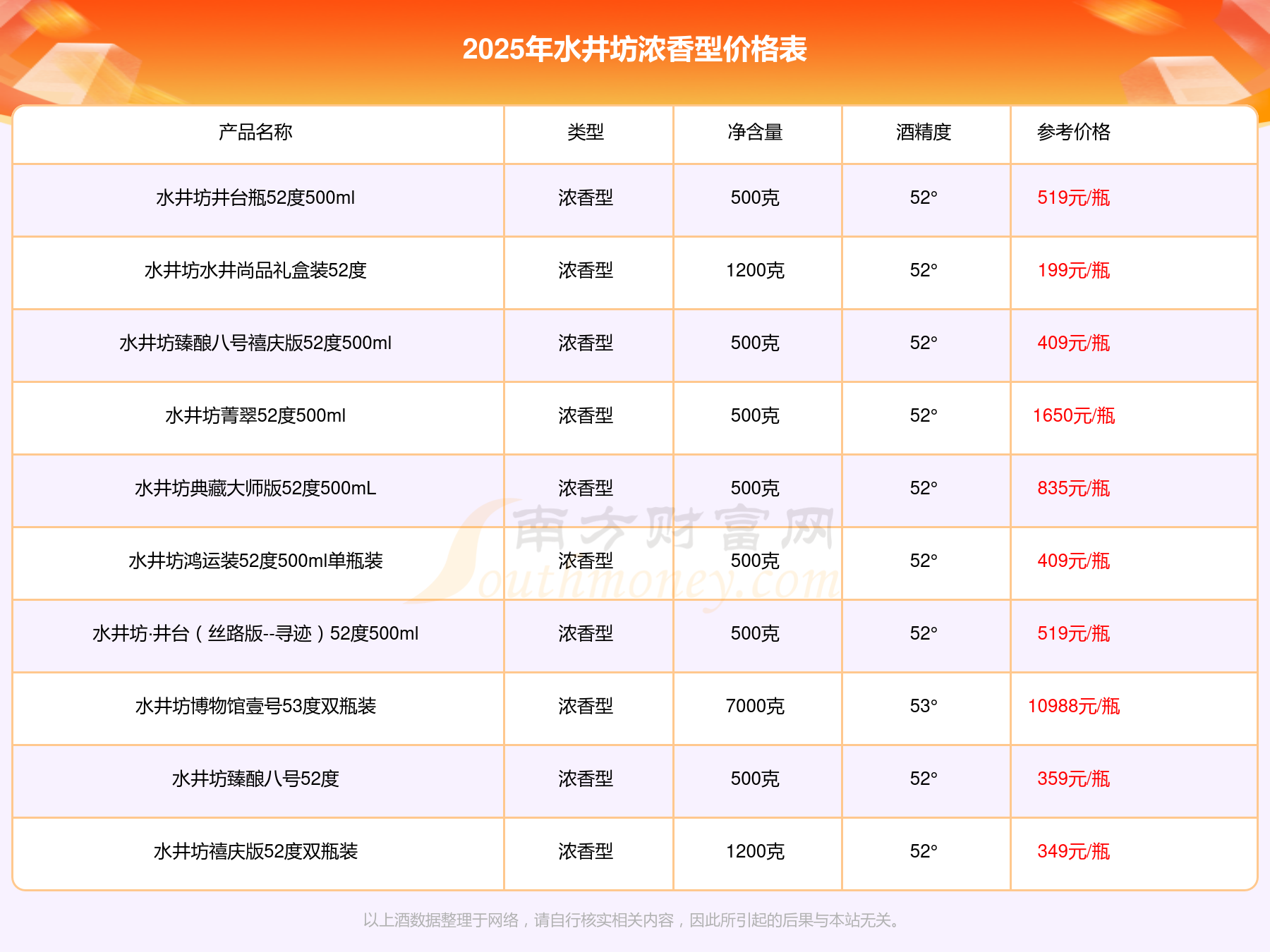 2025年,水井坊大壇收藏級(jí)原漿天球瓶66度、水井坊博物館壹號(hào)53度雙瓶裝、53°水井坊公元十三600ml、水井坊梅蘭竹菊52度濃香型600ml4瓶等水井坊濃香型酒價(jià)格如下:水井坊大壇收藏級(jí)原漿天球瓶66度參考價(jià)13999元/瓶、水井坊博物館壹號(hào)53度雙瓶裝參考價(jià)10988元/瓶、53°水井坊公元十三600ml參考價(jià)2580元/瓶、水井坊梅蘭竹菊52度濃香型600ml4瓶參考價(jià)1999元/瓶。