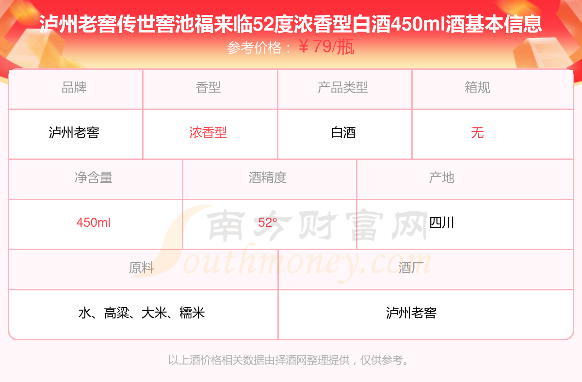 瀘州老窖傳世窖池福來臨52度濃香型白酒450ml基本信息