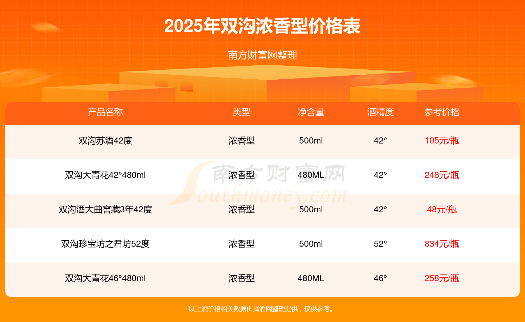 雙溝珍寶坊之君坊52度參考價834元/瓶、雙溝大青花46°480ml參考價258元/瓶、雙溝大青花42°480ml參考價248元/瓶、雙溝蘇酒42度參考價105元/瓶、雙溝酒大曲窖藏3年42度參考價48元/瓶。