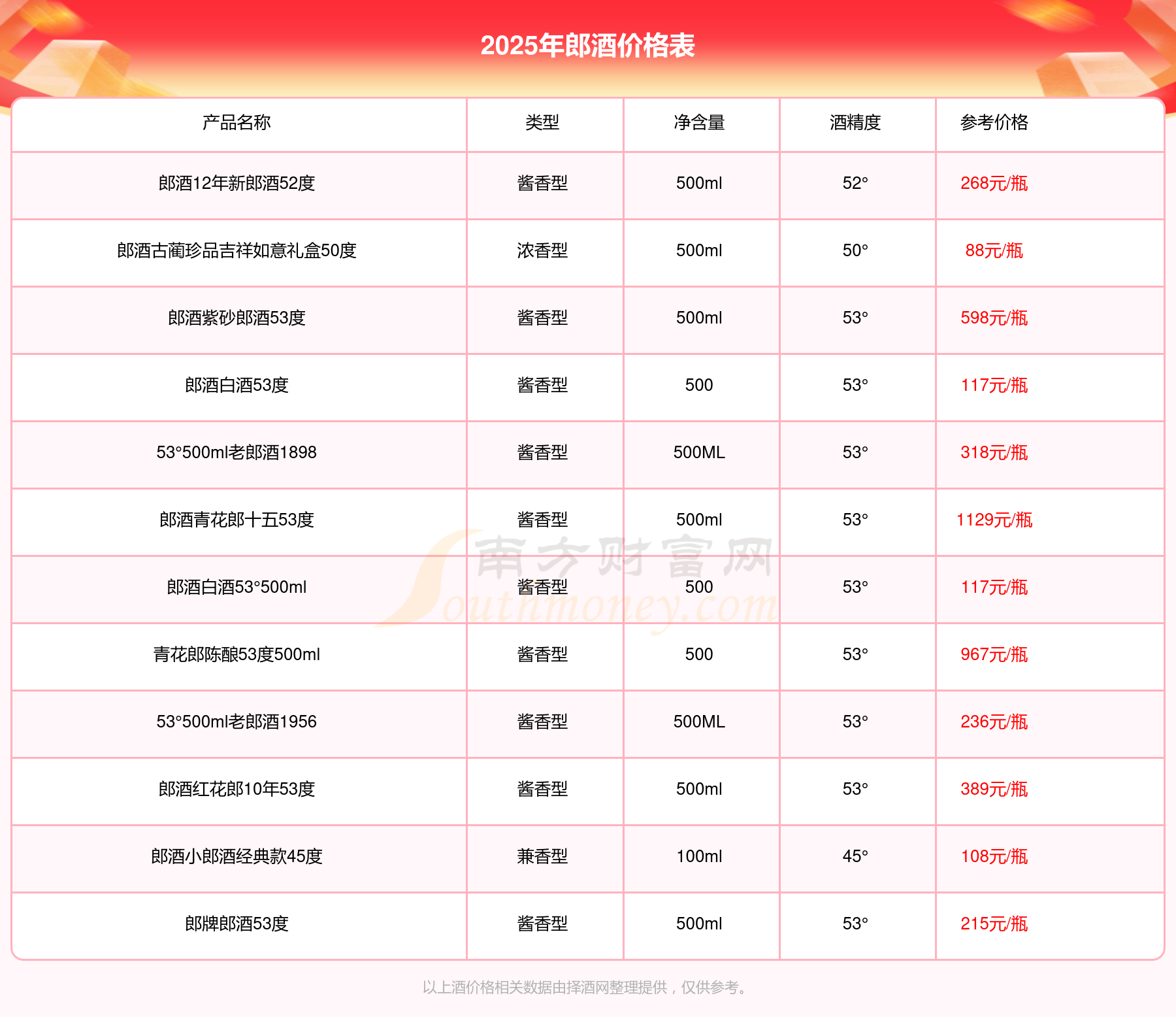 2025年,郎酒青花郎十五53度、青花郎陳釀53度500ml、郎酒紫砂郎酒53度、郎酒紅花郎10年53度、53°500ml老郎酒1898、郎酒12年新郎酒52度、53°500ml老郎酒1956等郎酒價(jià)格如下:郎酒青花郎十五53度參考價(jià)1129元/瓶、青花郎陳釀53度500ml參考價(jià)967元/瓶、郎酒紫砂郎酒53度參考價(jià)598元/瓶、郎酒紅花郎10年53度參考價(jià)389元/瓶、53°500ml老郎酒1898參考價(jià)318元/瓶、郎酒12年新郎酒52度參考價(jià)268元/瓶、53°500ml老郎酒1956參考價(jià)236元/瓶。