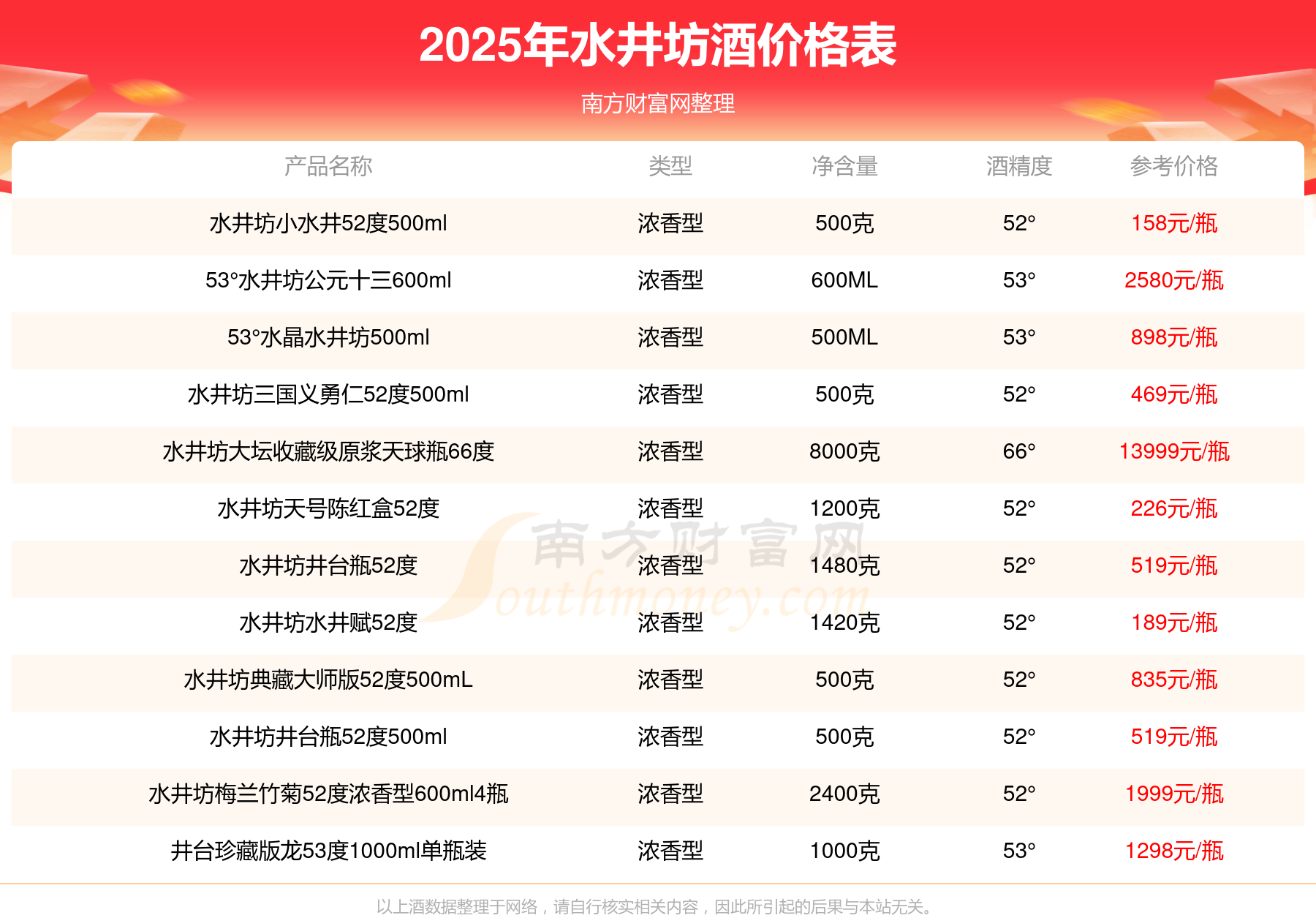 價格方面,水井坊的產(chǎn)品線涵蓋了次高端到高端的不同價格區(qū)間。其價格通常在158-13999元之間,價格高低差為13841元/瓶。