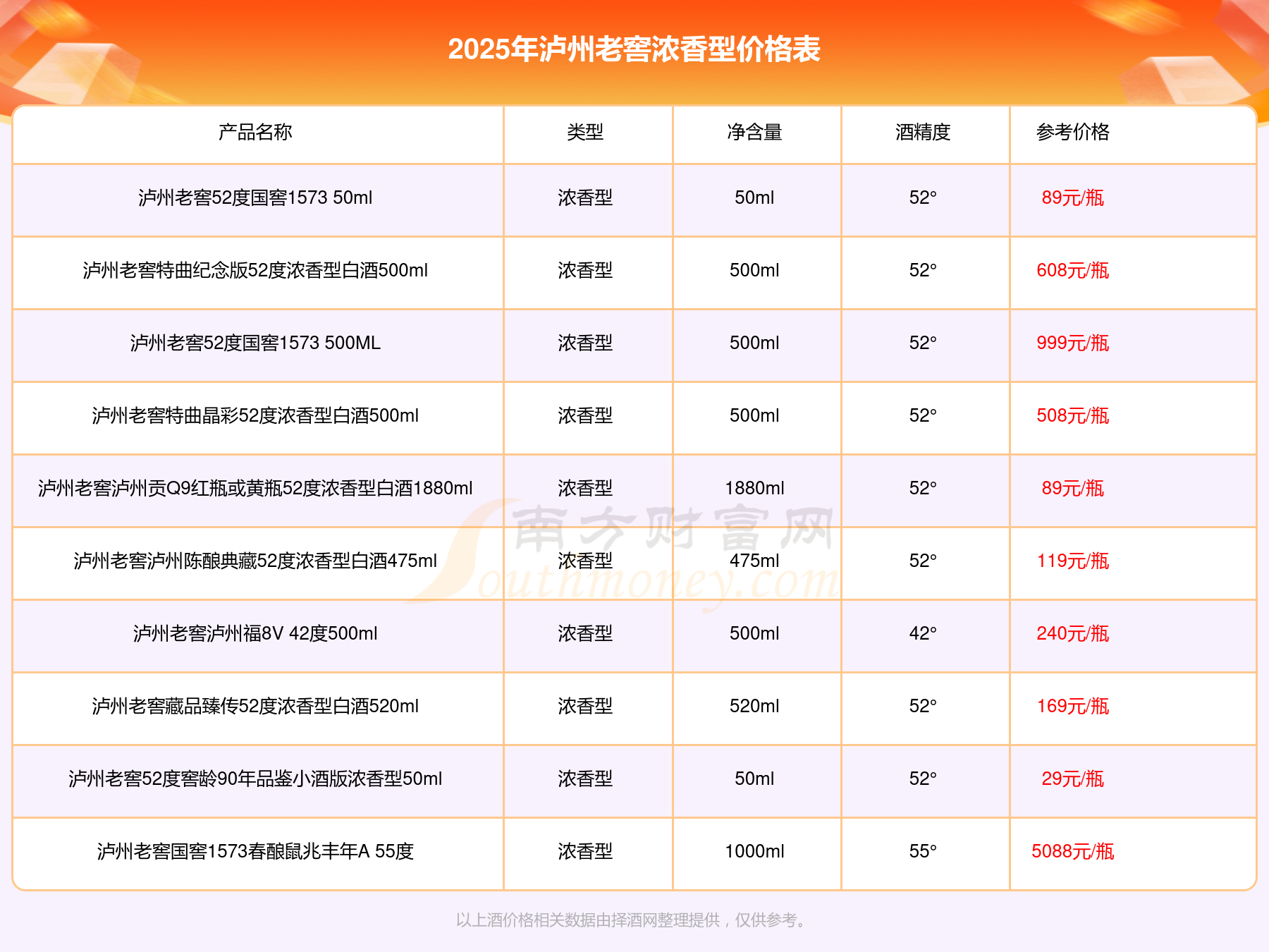 2025年,瀘州老窖國窖1573春釀鼠兆豐年E 55度、瀘州老窖國窖1573生命中的那壇酒55度014、瀘州老窖國窖1573春釀鼠兆豐年A 55度、瀘州老窖國窖1573生命中的那壇酒55度013濃香型白酒1000ml等瀘州老窖濃香型酒價(jià)格如下: